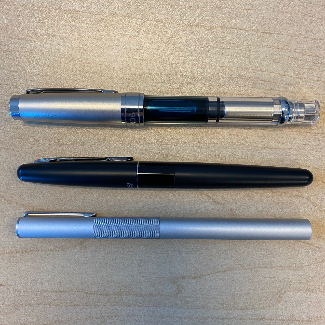 Визуальное сравнение Pilot Metropolitan с двумя другими ручками: Wing Sung 3008 (сверху) и Muji Aluminum (снизу).