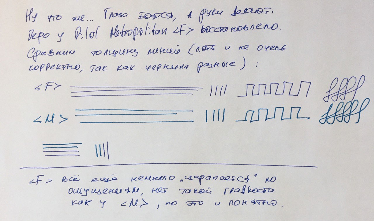 Добавляю сравнение F с M (только вот чернила в ручках разные). После восстановления F немного царапает бумагу. Хотя, возможно, это придирки после идеальной гладкости M.
