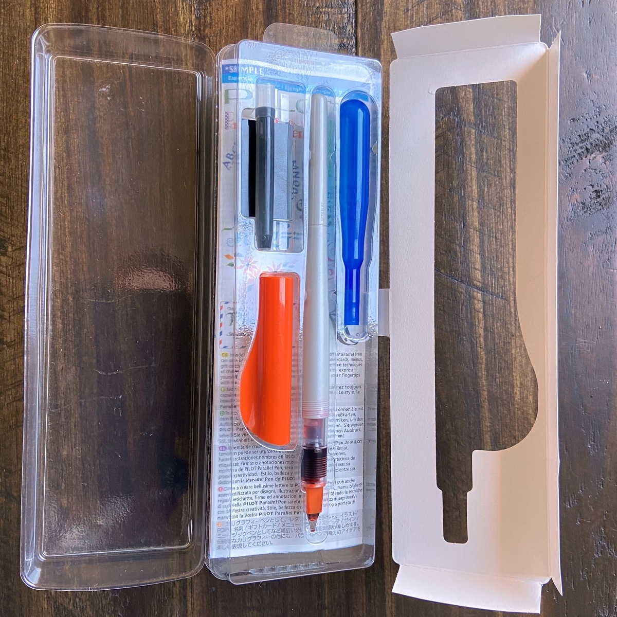 Pilot Parallel Pen упакована в прозрачный пластиковый блистер. С лицевой стороны есть окошко, через которое видно саму ручку (корпус и колпачок), два картриджа (Pilot Mixable Inks: красный и чёрный) и некую деталь (как оказалось, это инструмент для чистки пера, а я его сначала чуть не выкинул, ха-ха). С обратной стороны маячит инструкция.