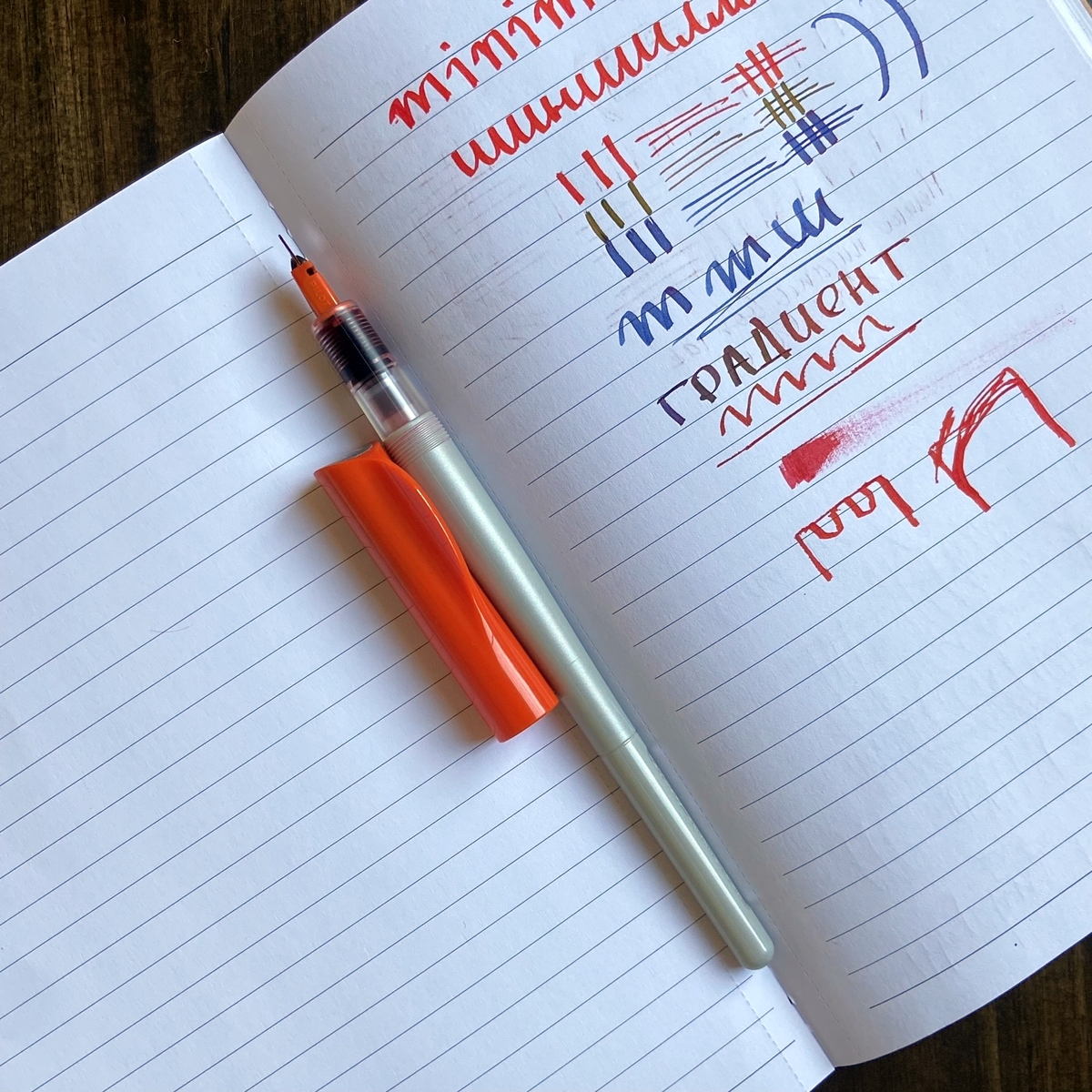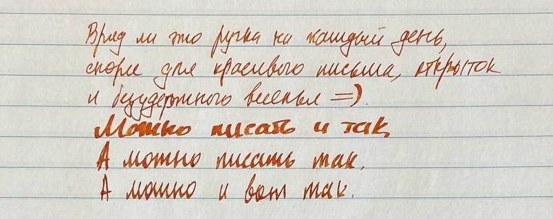 - перо требует хорошего позиционирования на бумаге; писать получается либо всей плоскостью (чтобы края обеих пластинок соприкасались с поверхностью) — и тогда письмо будет гладким, а линия широкой, либо углом — в этом случае перо ощутимо шумит и «фидбэчит», а толщина линии сравнима с F; непривычно, чем-то похожие ощущения возникают при письме стабом (разве что там углом невозможно);