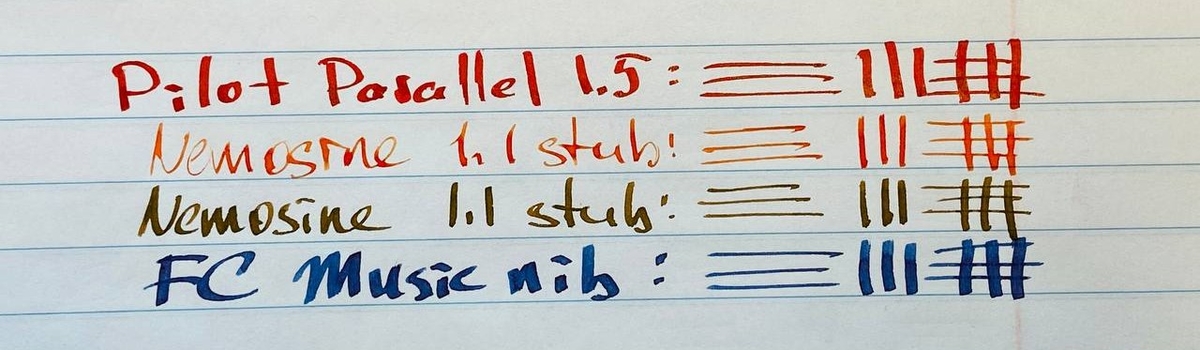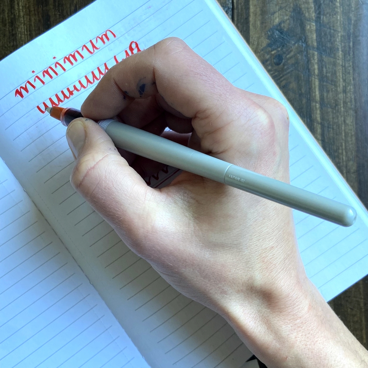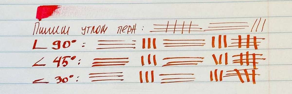- одна из особенностей пера (предсказуемо по его геометрии и сходству со стабами) — разная толщина горизонтальных и вертикальных линий; при этом можно поиграться с шириной, изменяя положение на бумаге: разные углы (относительно нижней половины листа/горизонтальных линовок) будут давать разные толщины;