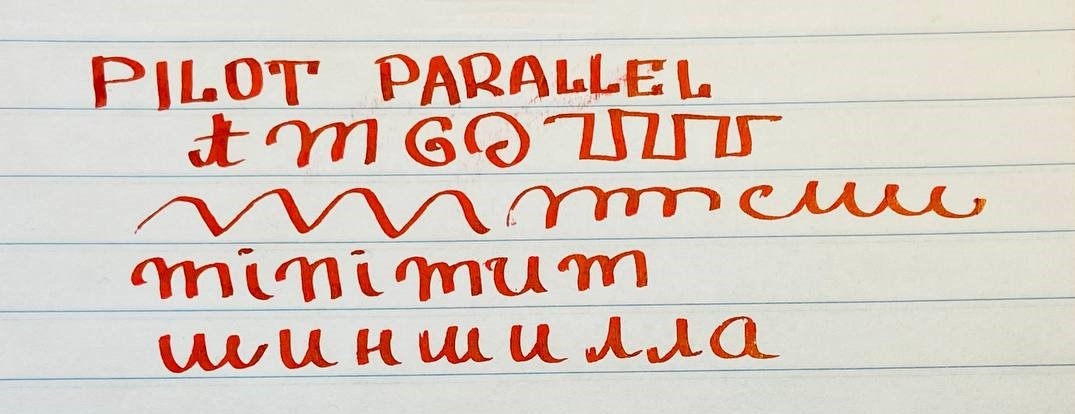 На что же способно такое перо? Давайте смотреть. Чернила — комплектный картридж из набора Pilot Parallel Mixable Red.
