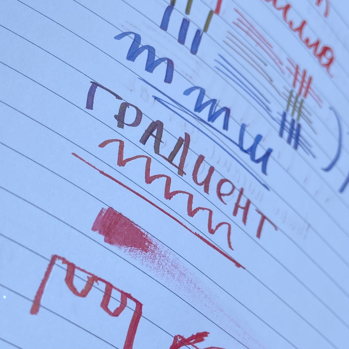 - можно обмакнуть краешек пера в чернила другого оттенка (или соединить перья ручек, заправленных разными) и получить градиентное изменение цвета при письме.