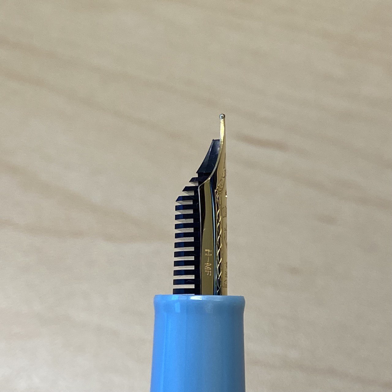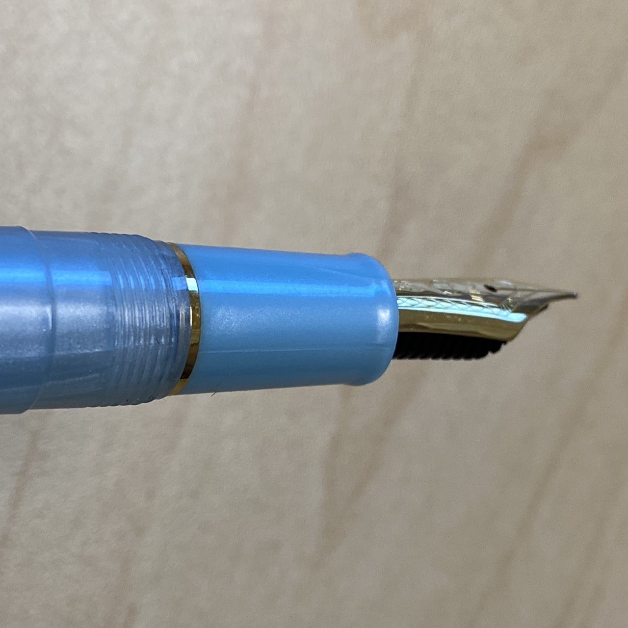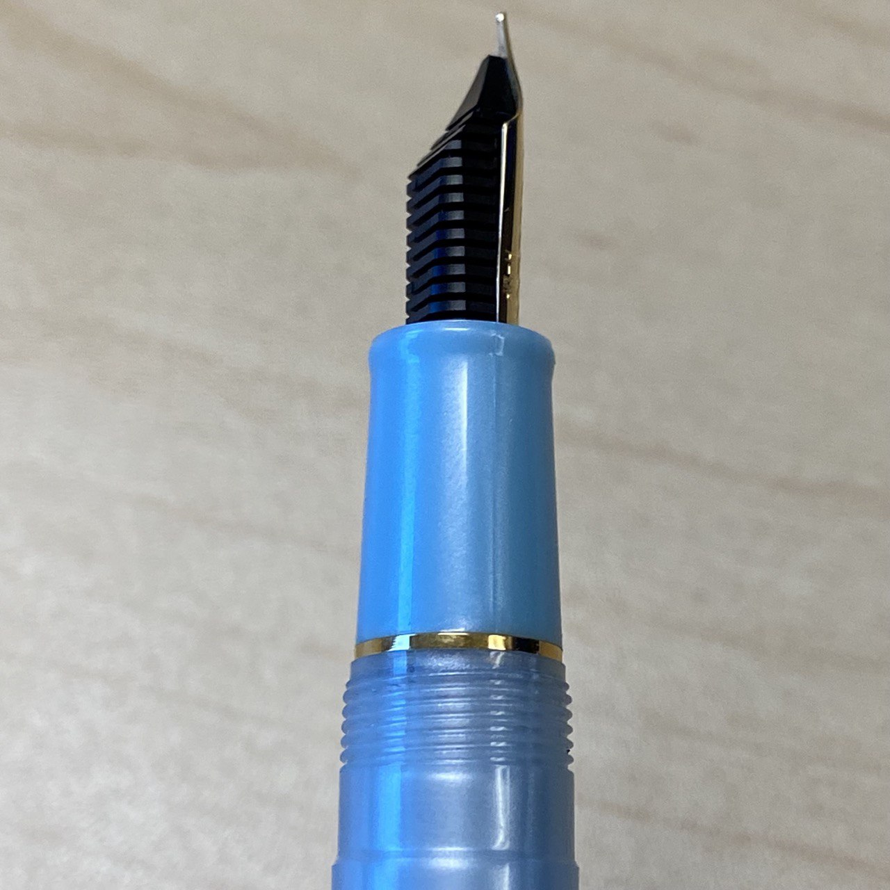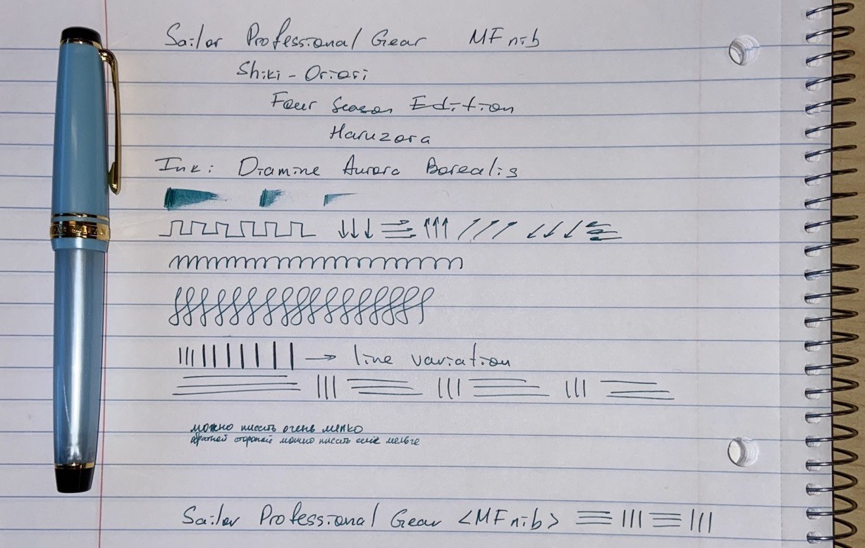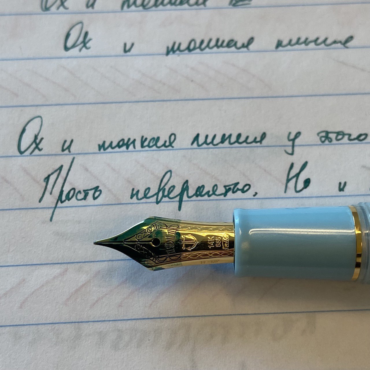 Первое, на что обращаешь внимание: у пера действительно есть фирменная сейлоровская обратная связь. Оно шуршит при письме по бумаге, примерно как твёрдый карандаш.