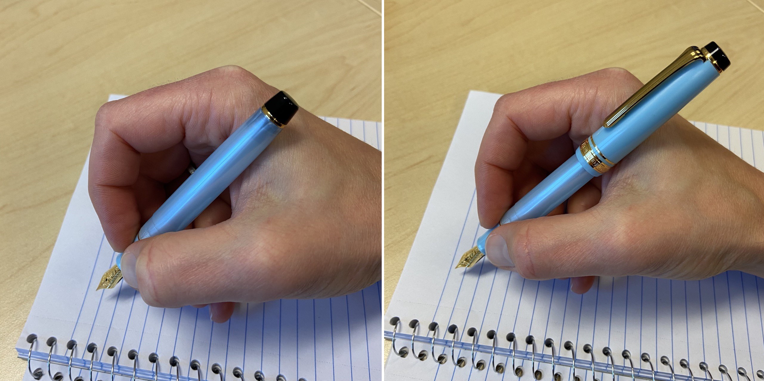 Главный минус (для меня) — ручка оказалась очень маленькой! Без колпачка писать ею совершенно неудобно (сгодится разве что для быстрых заметок в пару слов). При надетом же на торец колпачке баланс сильно смещается назад (я напоминаю: корпус весит 10 г, колпачок — 7 г!). Вот вам и любимые многими лёгкие японцы…