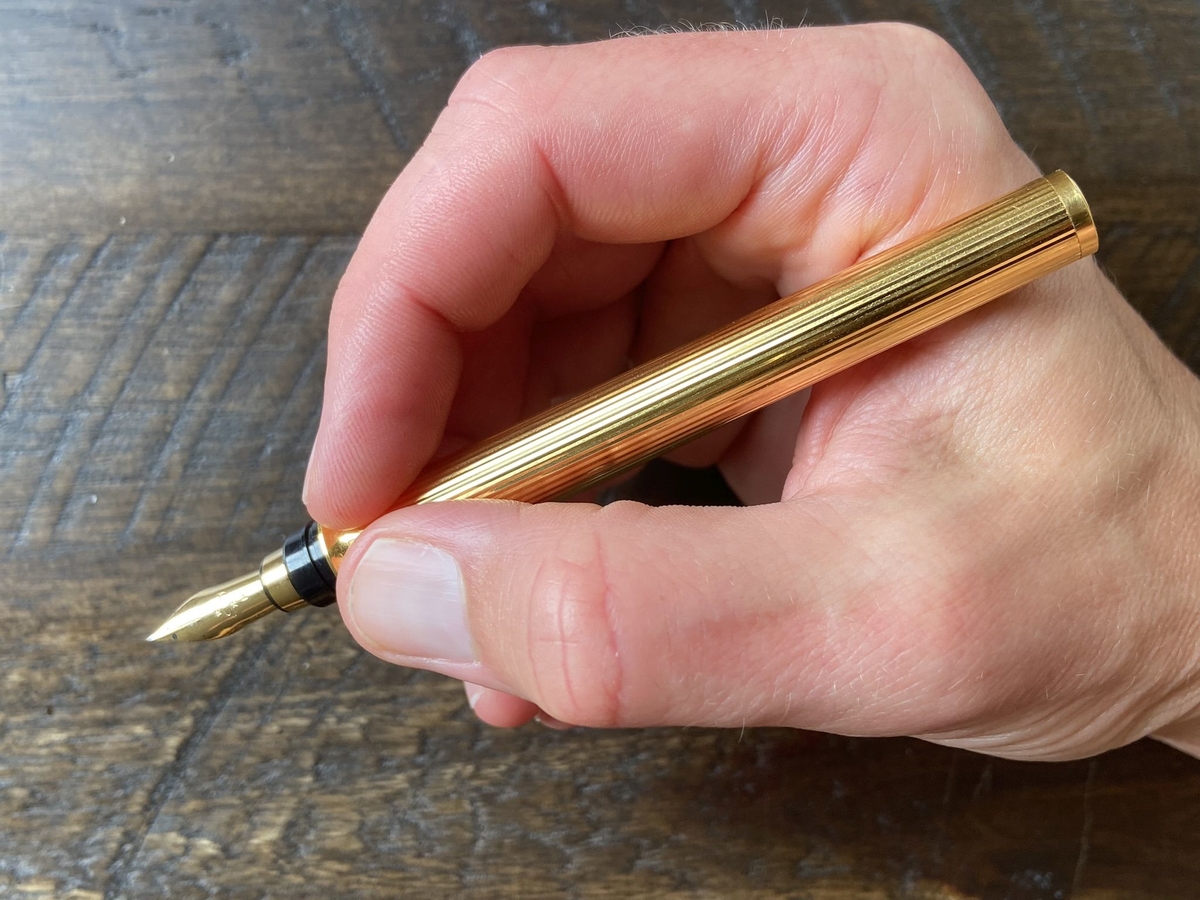 За 3/4 оборота (отличный результат!) откручиваем колпачок и видим непривычной формы перо: оно трубчатое. На лицевой стороне следующие обозначения: 18 ct, витиеватая прописная буква D, проба золота — 750, размерность — М.