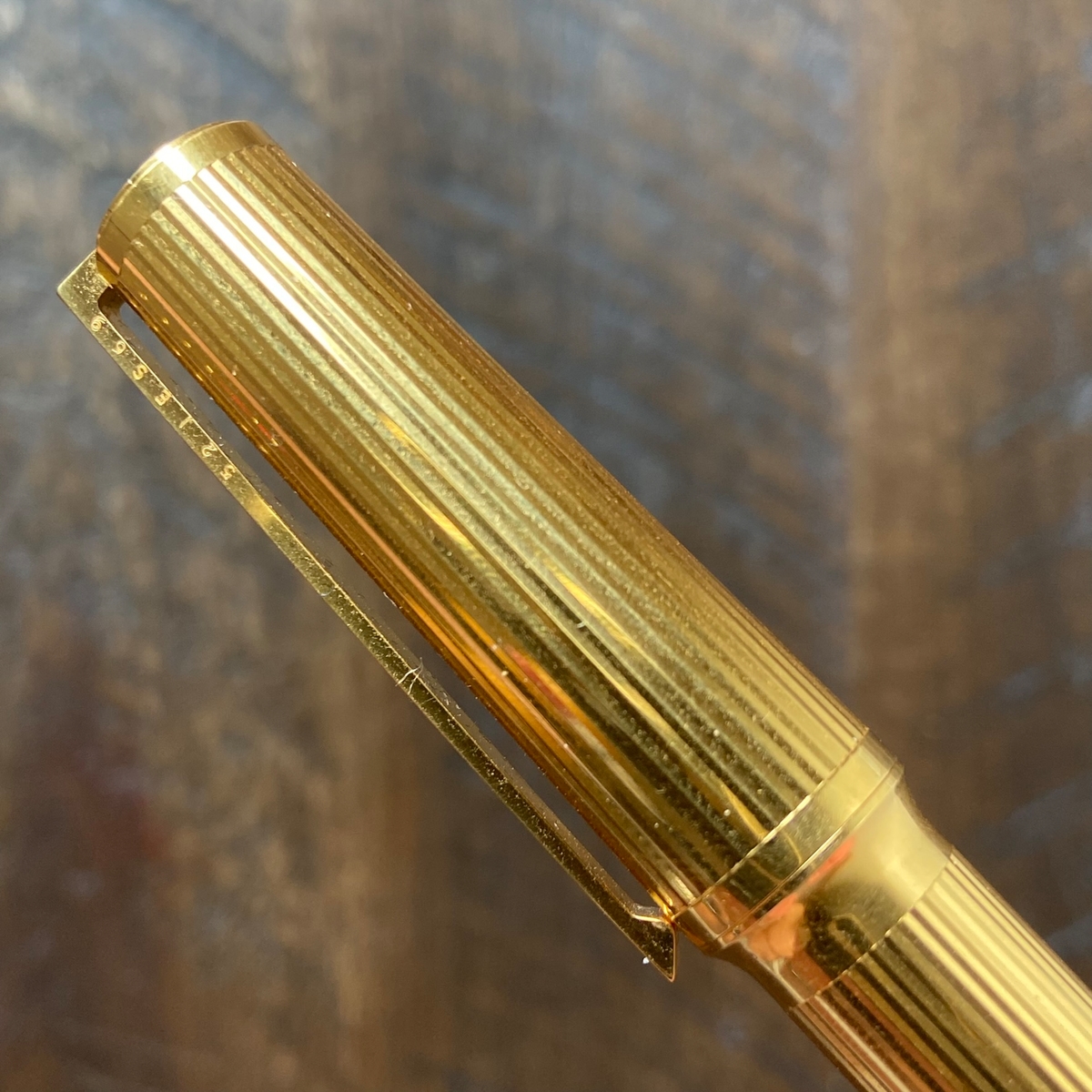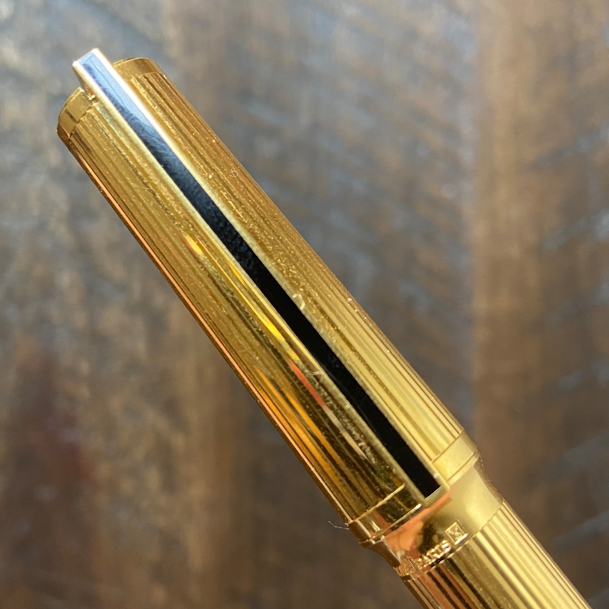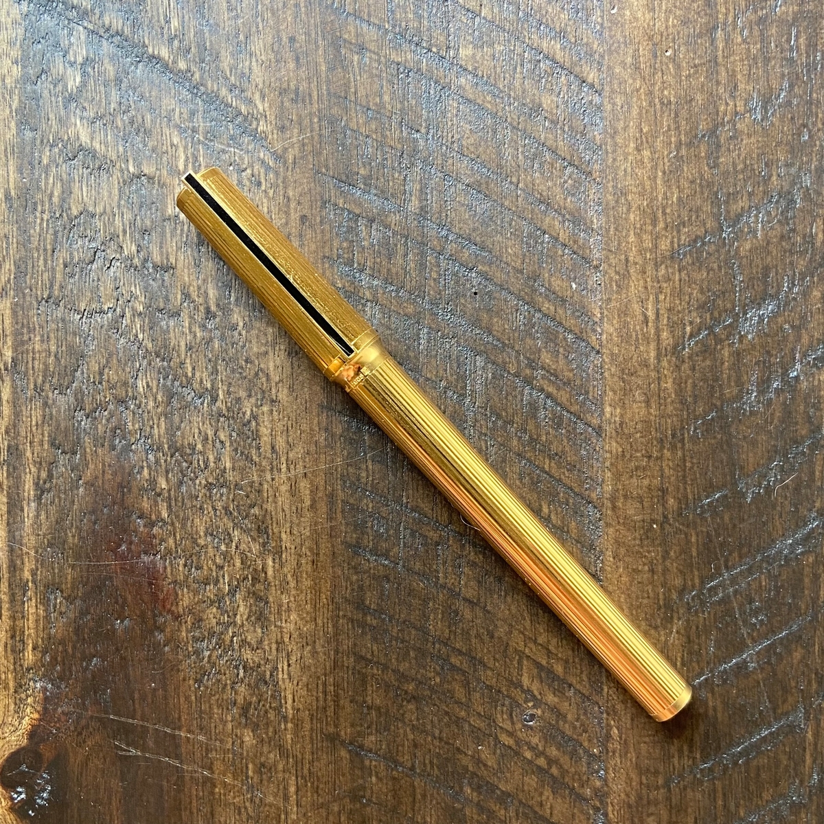Итак, S.T. Dupont Montparnasse в золотистом цвете... Элегантная и, на мой взгляд, очень интересная по дизайну. Из отличительных черт, помимо упомянутых уже насечек, стильный чёрный клип, утолщение у границы между корпусом и колпачком.