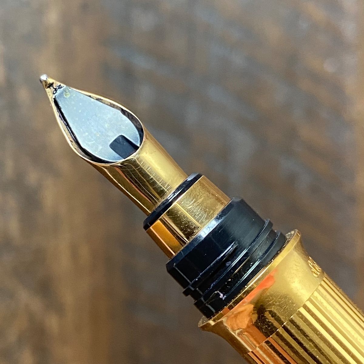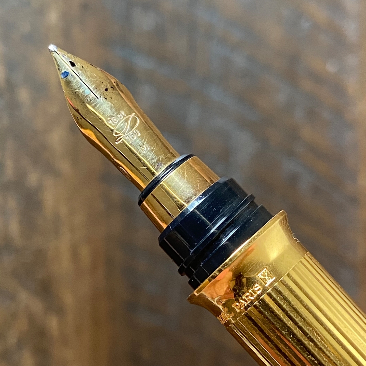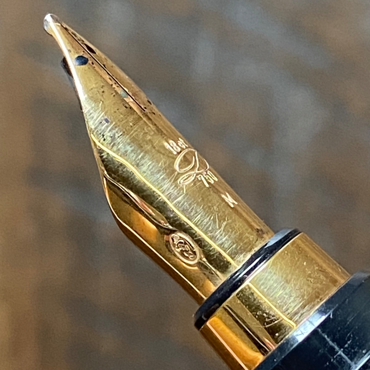 За 3/4 оборота (отличный результат!) откручиваем колпачок и видим непривычной формы перо: оно трубчатое. На лицевой стороне следующие обозначения: 18 ct, витиеватая прописная буква D, проба золота — 750, размерность — М.