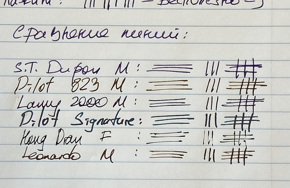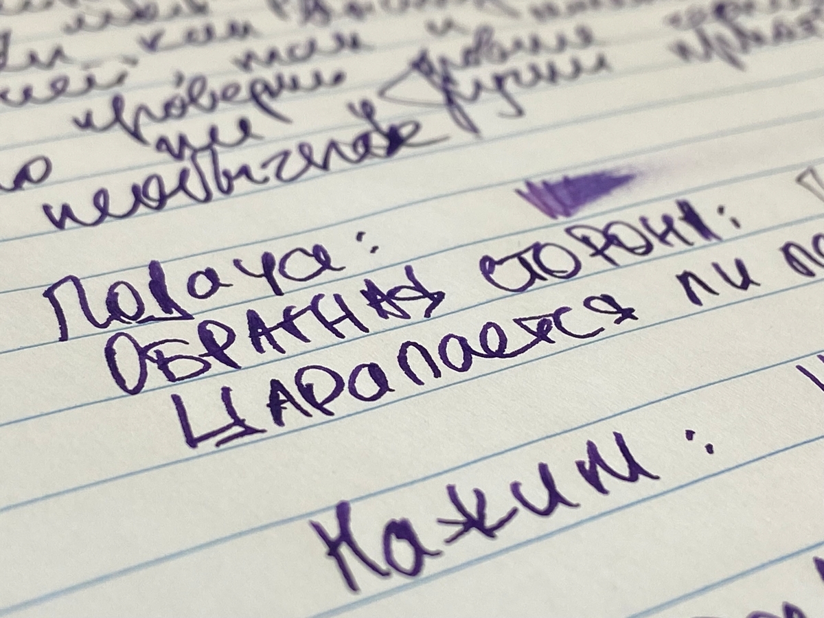 Перо отлично отполировано и прекрасно скользит по бумаге с небольшим шуршанием. Пропусков и хардстартов не обнаружил: ручка лежала без дела около двух недель и начала работу мгновенно.