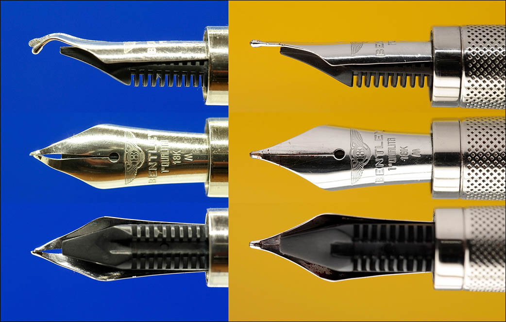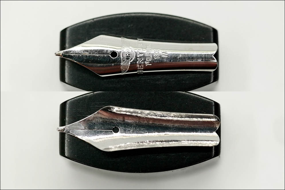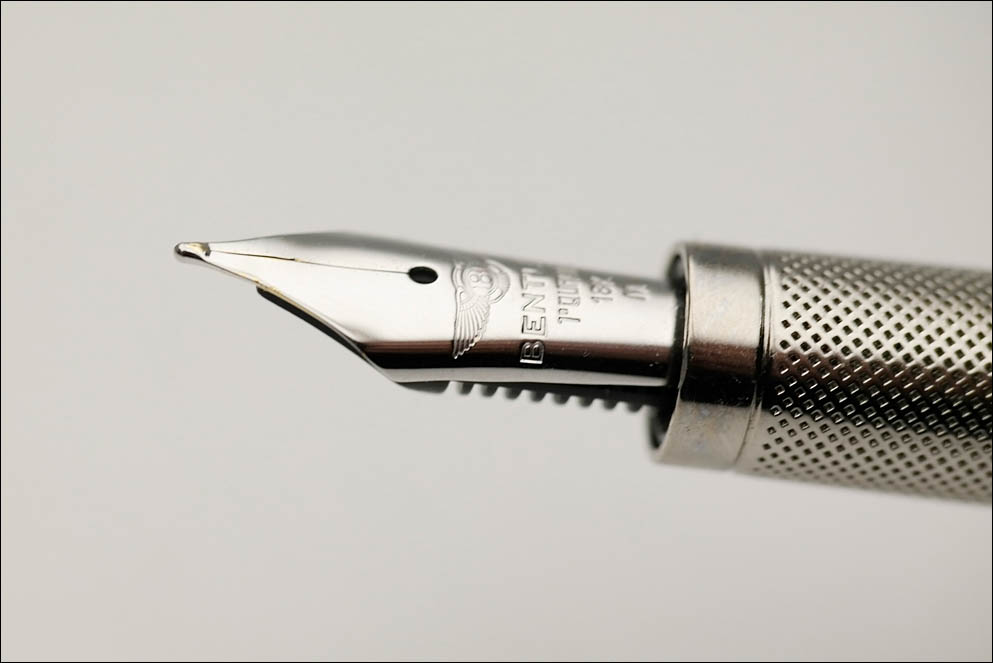 Золотое, 18-каратное, 5-го размера, покрыто родием. Ординарное, но обладает некоторой упругостью, поэтому его условно можно назвать мягким. На перо нанесён фирменный логотип Bentley — буква B с крыльями, ниже полное имя бренда — BENTLEY, ещё ниже — 1st Quality, 18K и размерность M.