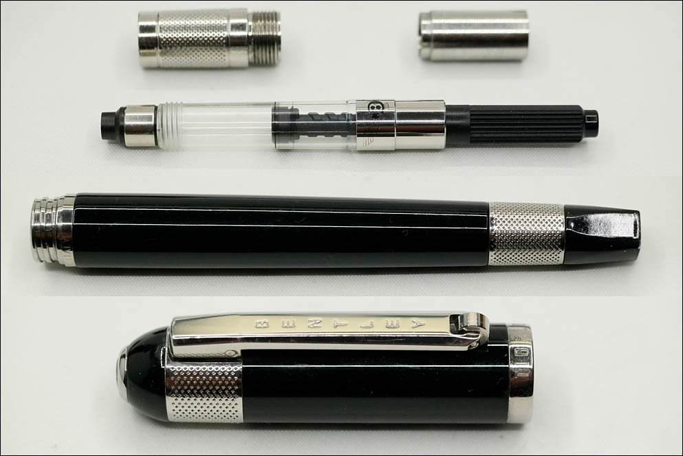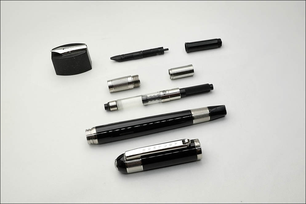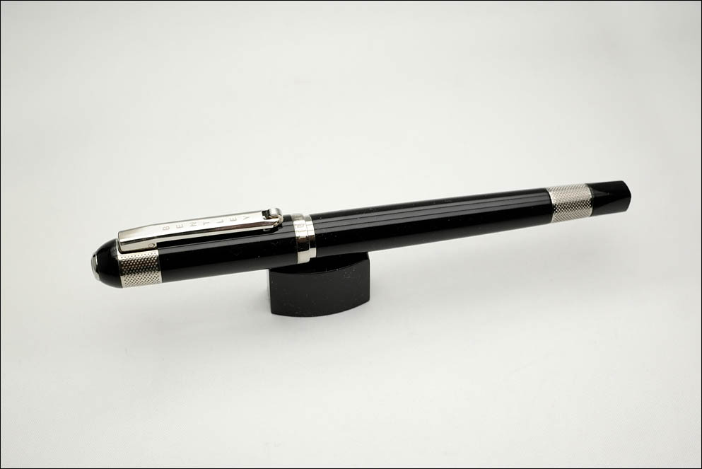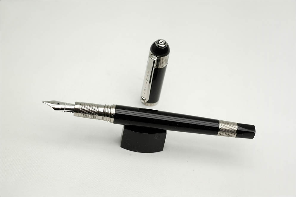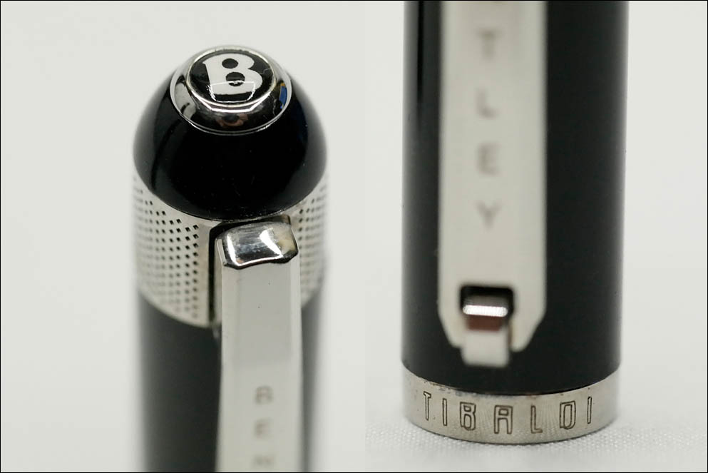 Корпус ручки выполнен из алюминия ручной работы и покрыт лаком цвета фирменных отделок Bentley: в данном случае — чёрным лаком Beluga Black (ещё были Silver Lake и Magenta). Корпус цилиндрический, но окончание имеет квадратное сечение. Форма напоминает мне торпеду времён Второй мировой войны. Система заправки — картриджно-конвертерная формата International. Колпачок на резьбе, резьба однозаходная, открытие за один полный и 3/4 оборота.