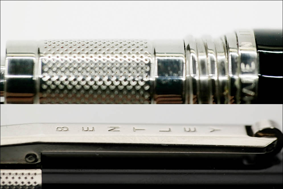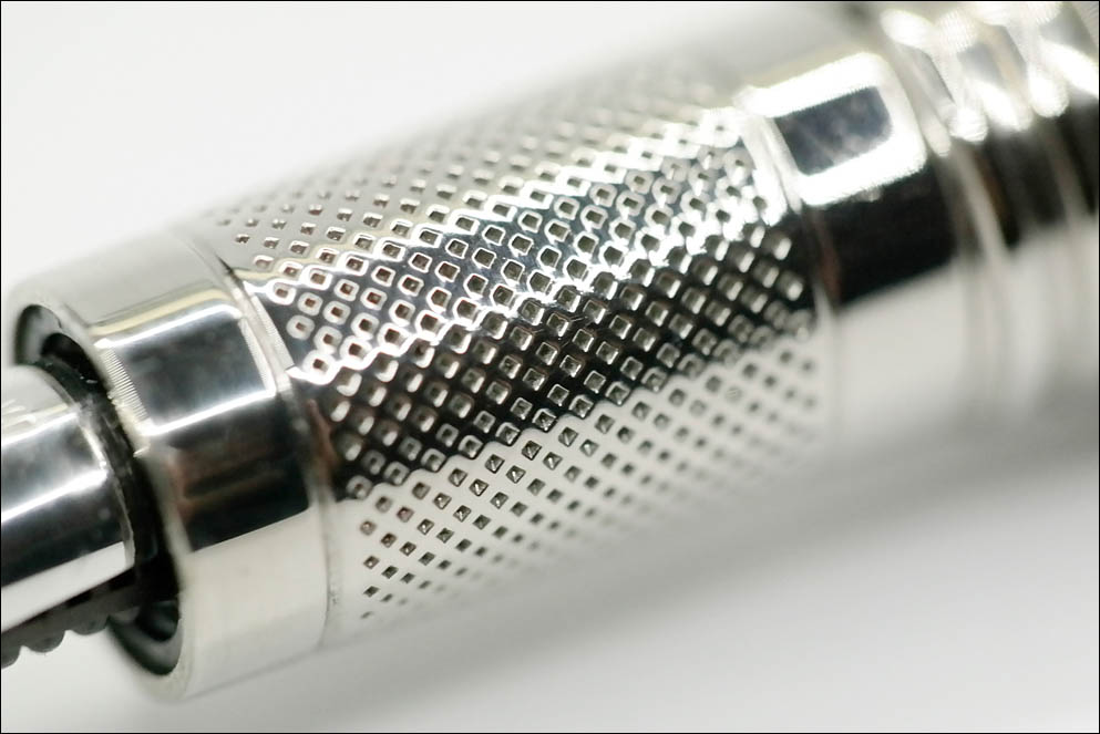А вот интересная особенность дизайна: в отличие от традиционных насечек на современных механических карандашах, насечки на ручке выполнены в виде не «пирамид» наружу, а пирамидальных углублений. И, как ни парадоксально, такой грип тоже достаточно цепкий, не скользит.