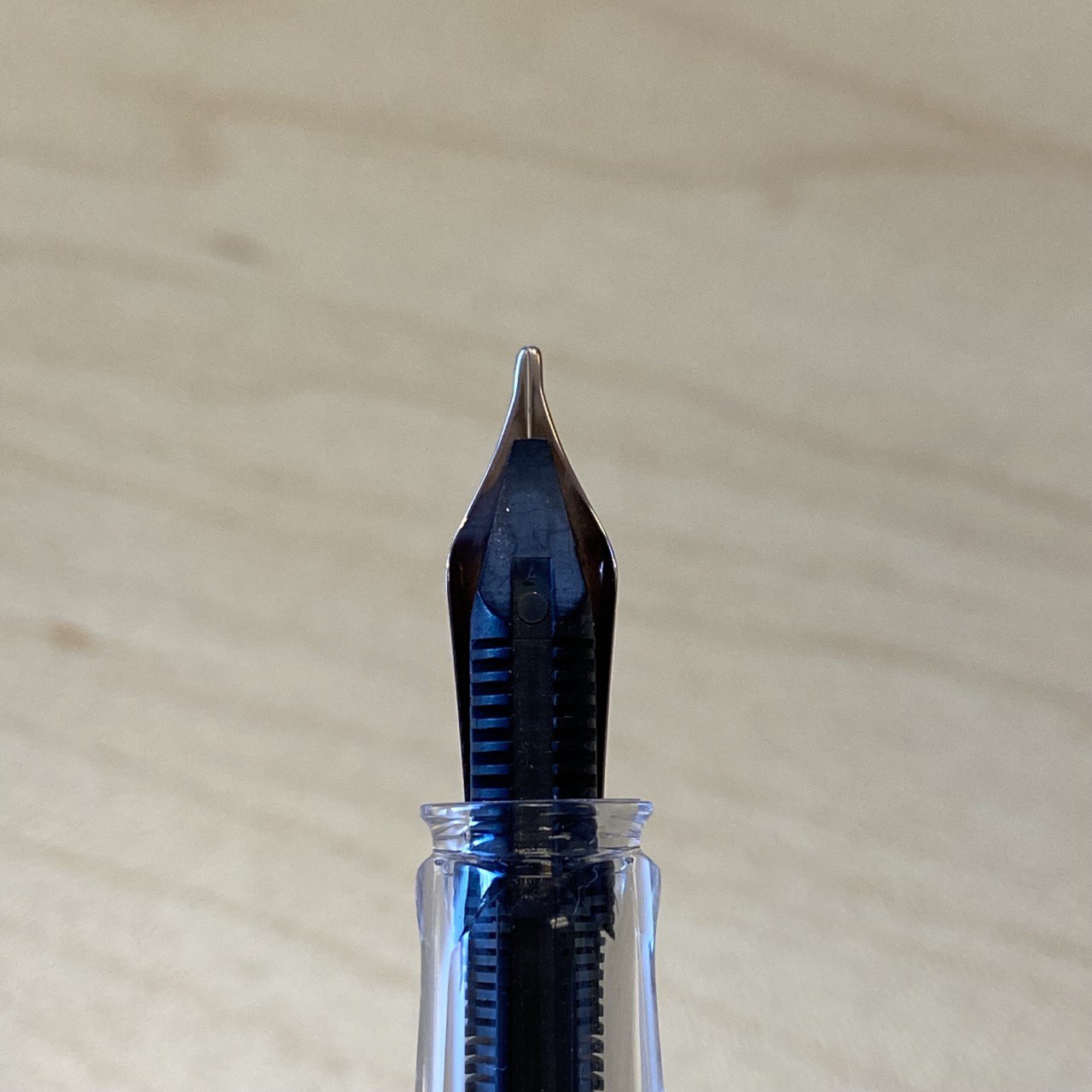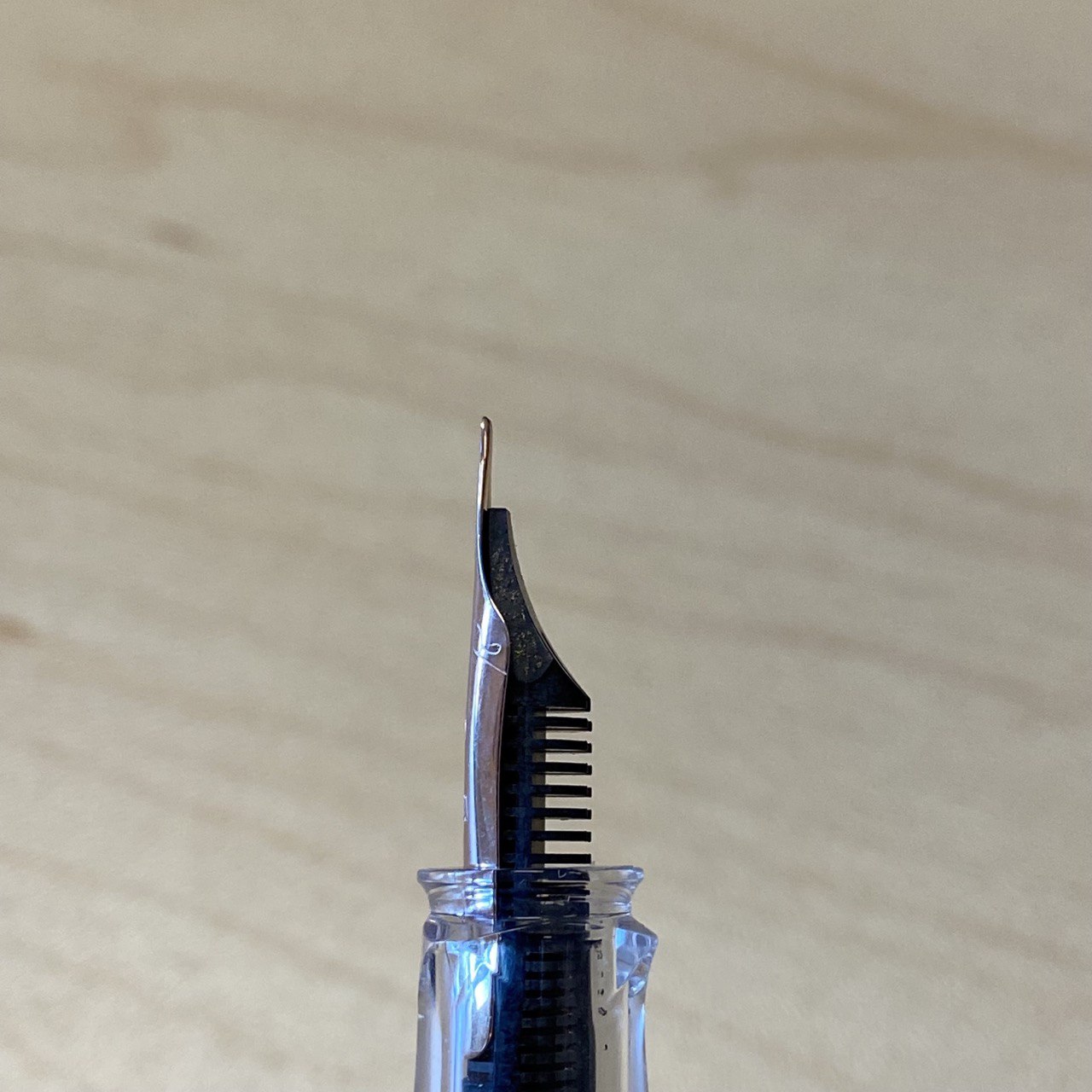 У TWSBI ECO стальное стаб-перо, #5. Даёт тонкую горизонтальную линию и толстую вертикальную. То, что это стаб, видно по более-менее плоскому кончику и надписи 1.1 у основания.