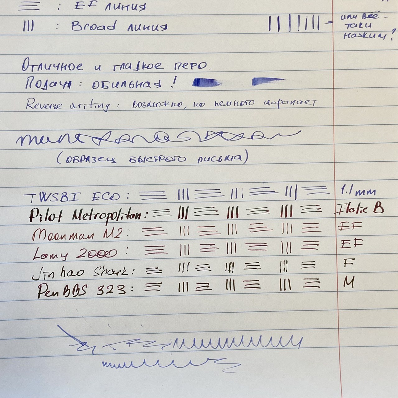 Итак, перо показало себя с лучшей стороны: пишет очень гладко, мягко и тихо, обратной связи практически нет, подача в меру обильная. Отличное!