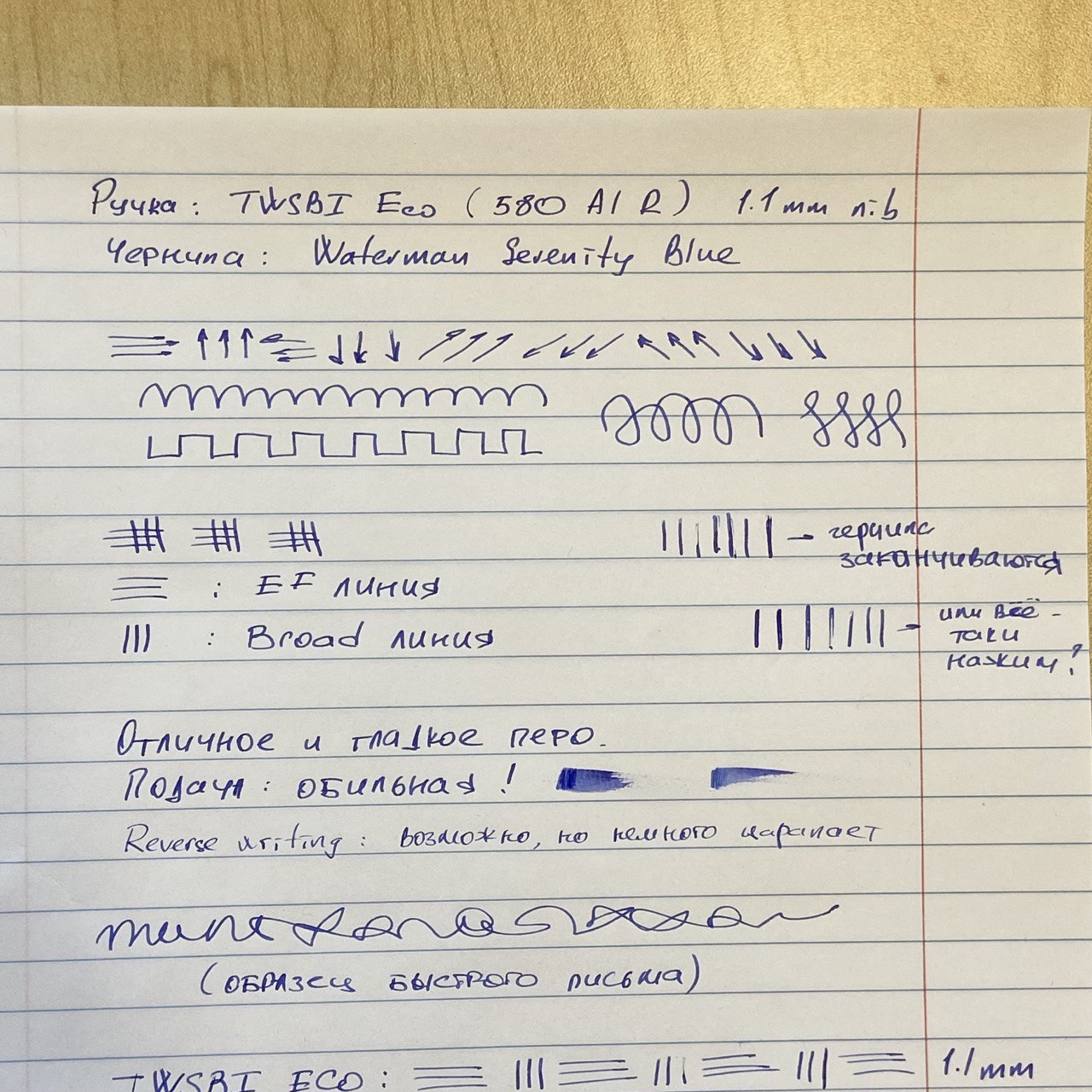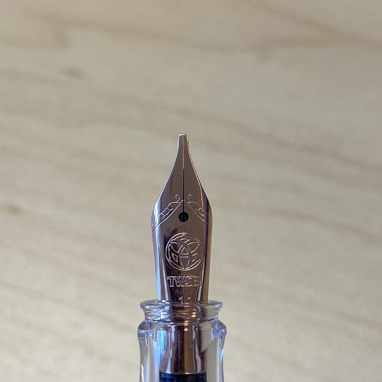У TWSBI ECO стальное стаб-перо, #5. Даёт тонкую горизонтальную линию и толстую вертикальную. То, что это стаб, видно по более-менее плоскому кончику и надписи 1.1 у основания.