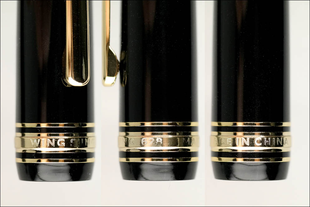 Колпачок украшен позолоченным (?) клипом, по форме на 98 % напоминающим клип Montblanc в 146/149 моделях, и тремя кольцами, аналогичными им же (за тем исключением, что на центральном кольце нанесён текст — WING SUNG 628 MADE IN CHINA — похожим на Montblanc шрифтом).