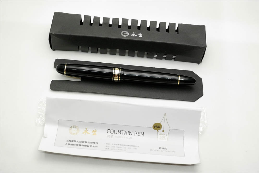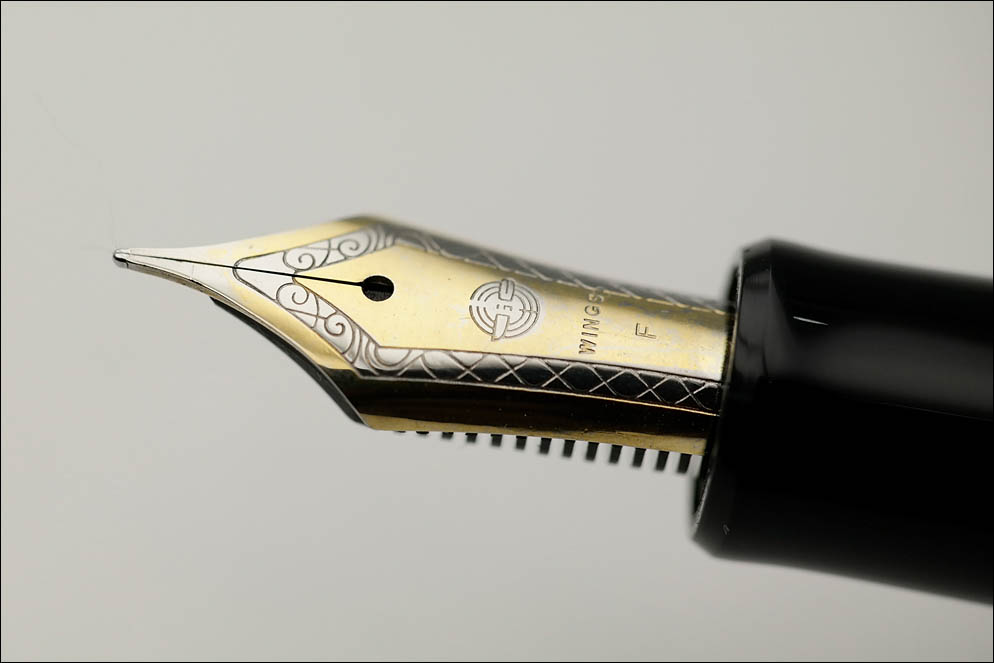 Стальное, покрытое материалом золотого цвета, жёсткое, 6-го укороченного размера, практически идентичное перу модели Sailor 1911 Standard. По периметру на него нанесены орнаментальный узор, логотип компании — стилизованная ручка в мишени, имя бренда Wing Sung и размерность пера F. Перо с пластиковым фидером крепится в секции на трении, ключей никаких нет.