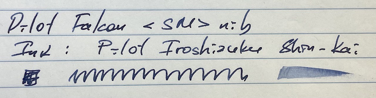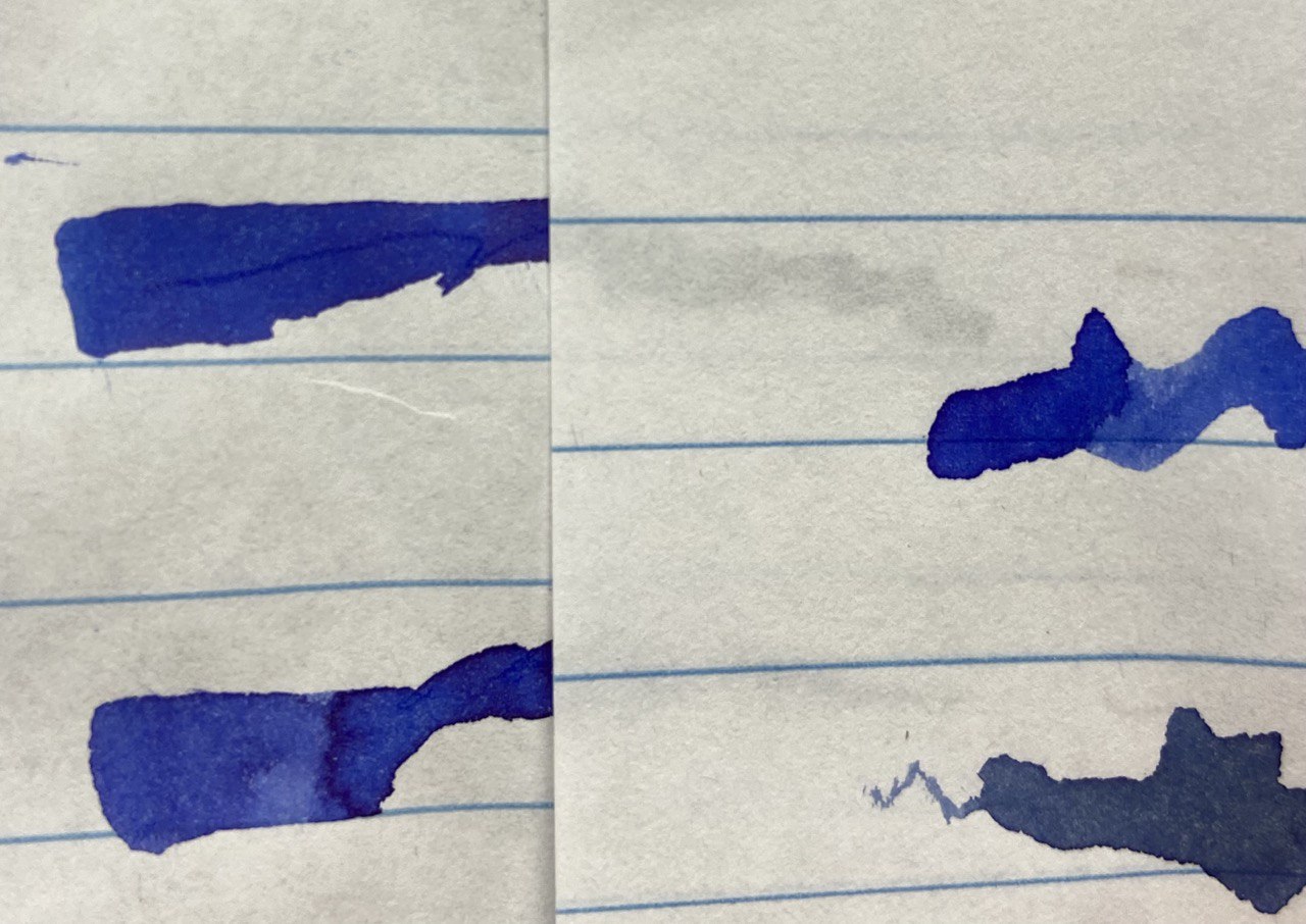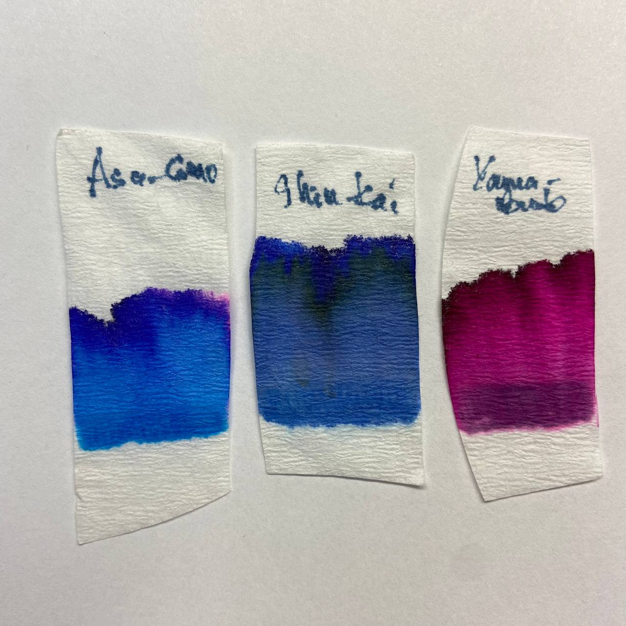 Для Shin-kai — Diamine Prussian Blue (слева на первой фотографии) и Califilio's Botany Bay (слева на второй).