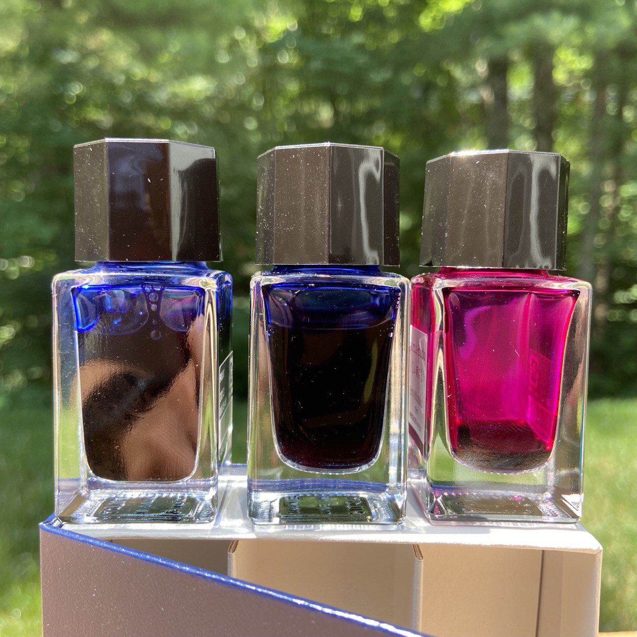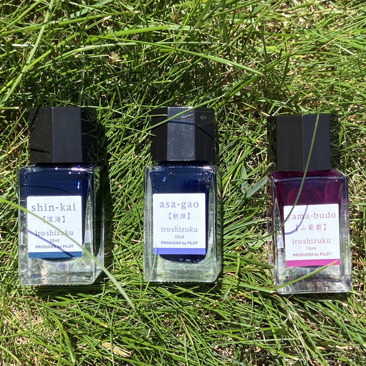 Как я уже отмечал, при создании оттенков этой коллекции чернил производители вдохновлялись природой Японии. Yama-budo — горный виноград Куанье (за основу взят цвет его листьев осенью), Shin-kai — цвет тёмного моря, Asa-gao — цветок ипомея, одно из самых популярных садовых растений в Стране восходящего солнца.