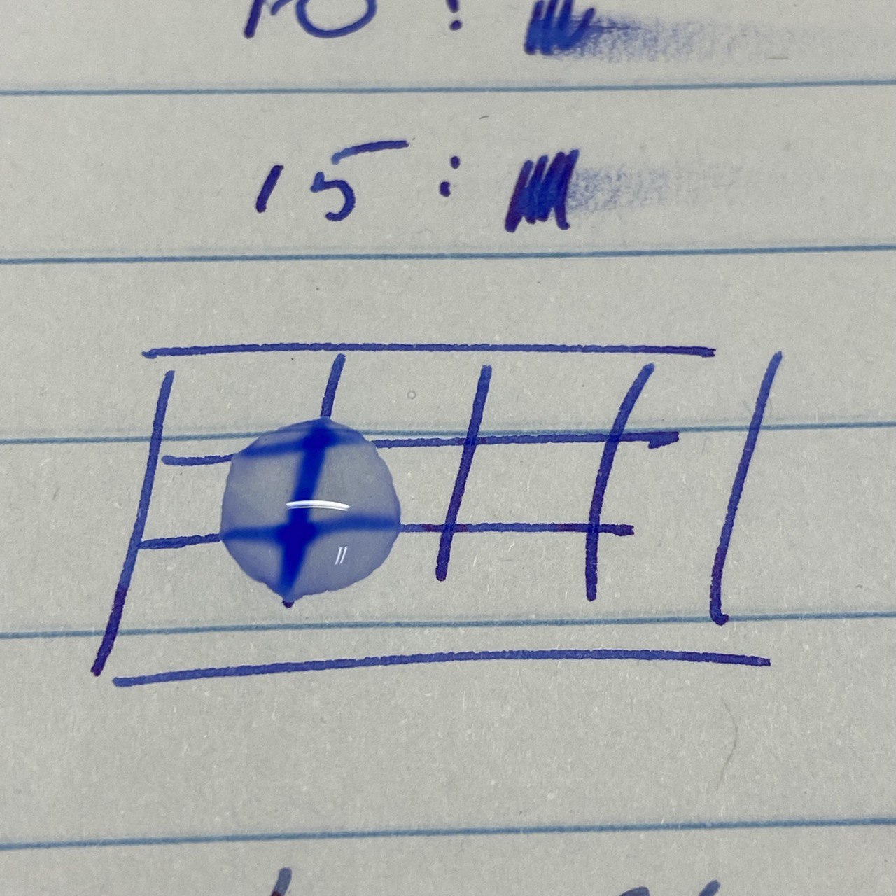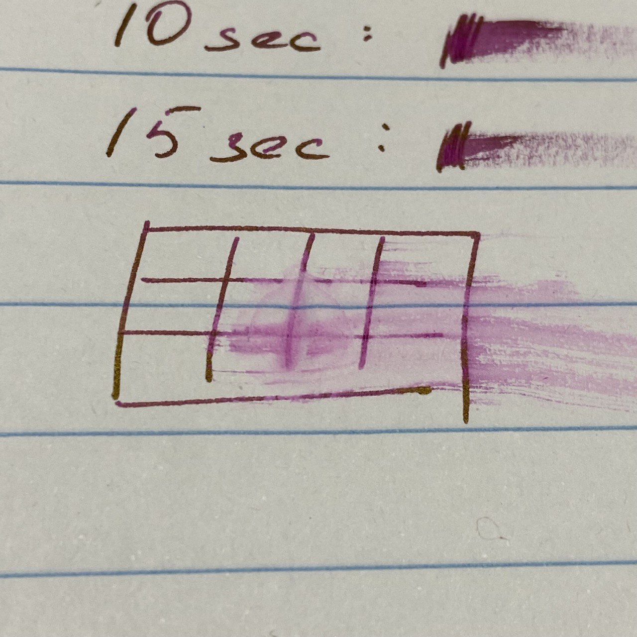 Но поначалу у меня с ними возникли некоторые недопонимания: сразу «из коробки» они вообще не хотели давать шин. Только когда одна из ручек долго полежала заправленная (при этом часть воды из чернил испаряется, цвет становится более насыщенным), я его увидел. У других пользователей, судя по их обзорам, шин появлялся сразу.
