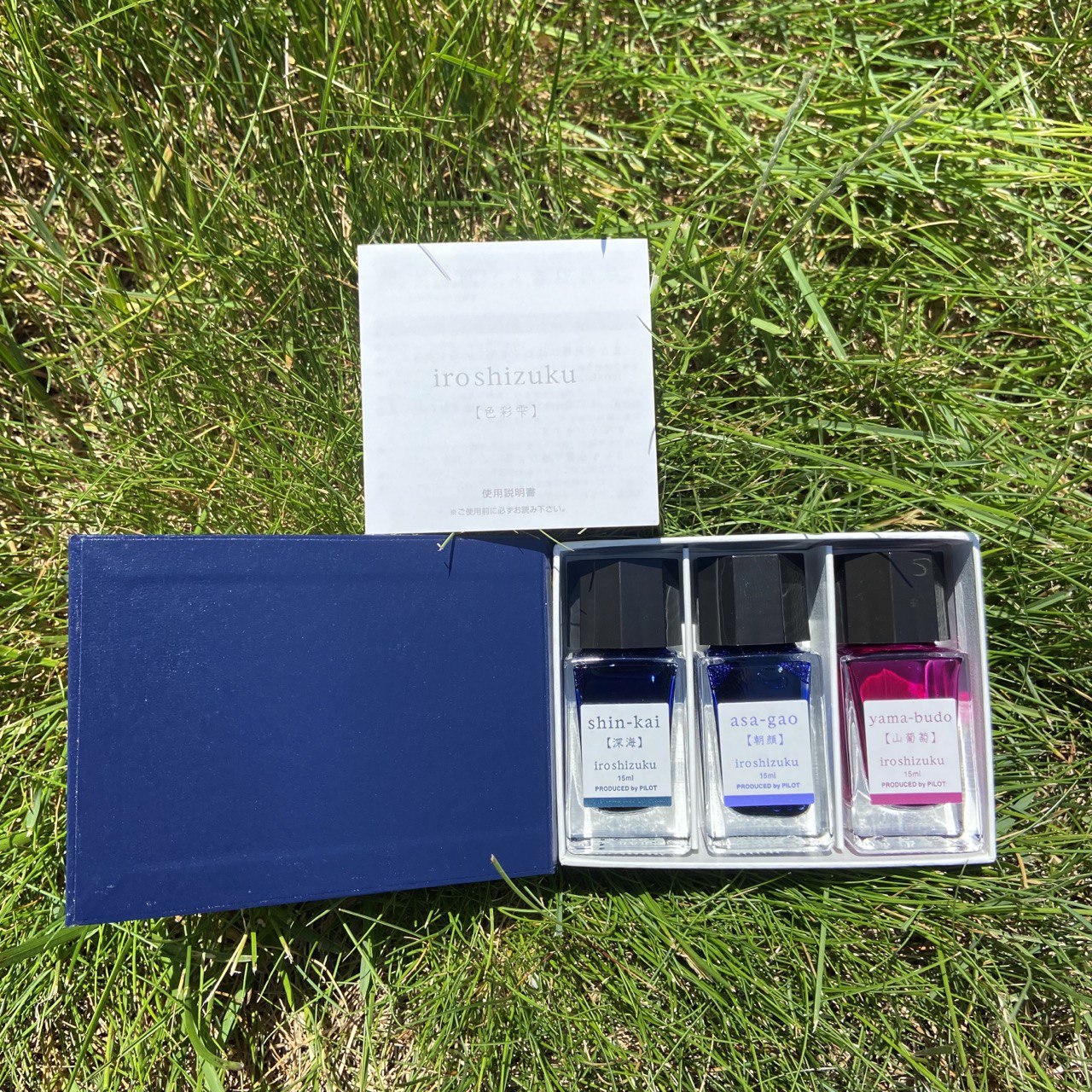 Pilot Iroshizuku продаются в дизайнерских стеклянных флаконах, которые за свою красоту были даже отмечены наградами. На выбор баночки по 15 и 50 мл, и я намеревался приобрести одну большую. Но также хотелось попробовать разные цвета без лишних вложений, поэтому для начала пришлось заказать набор из трёх флакончиков по 15 мл.