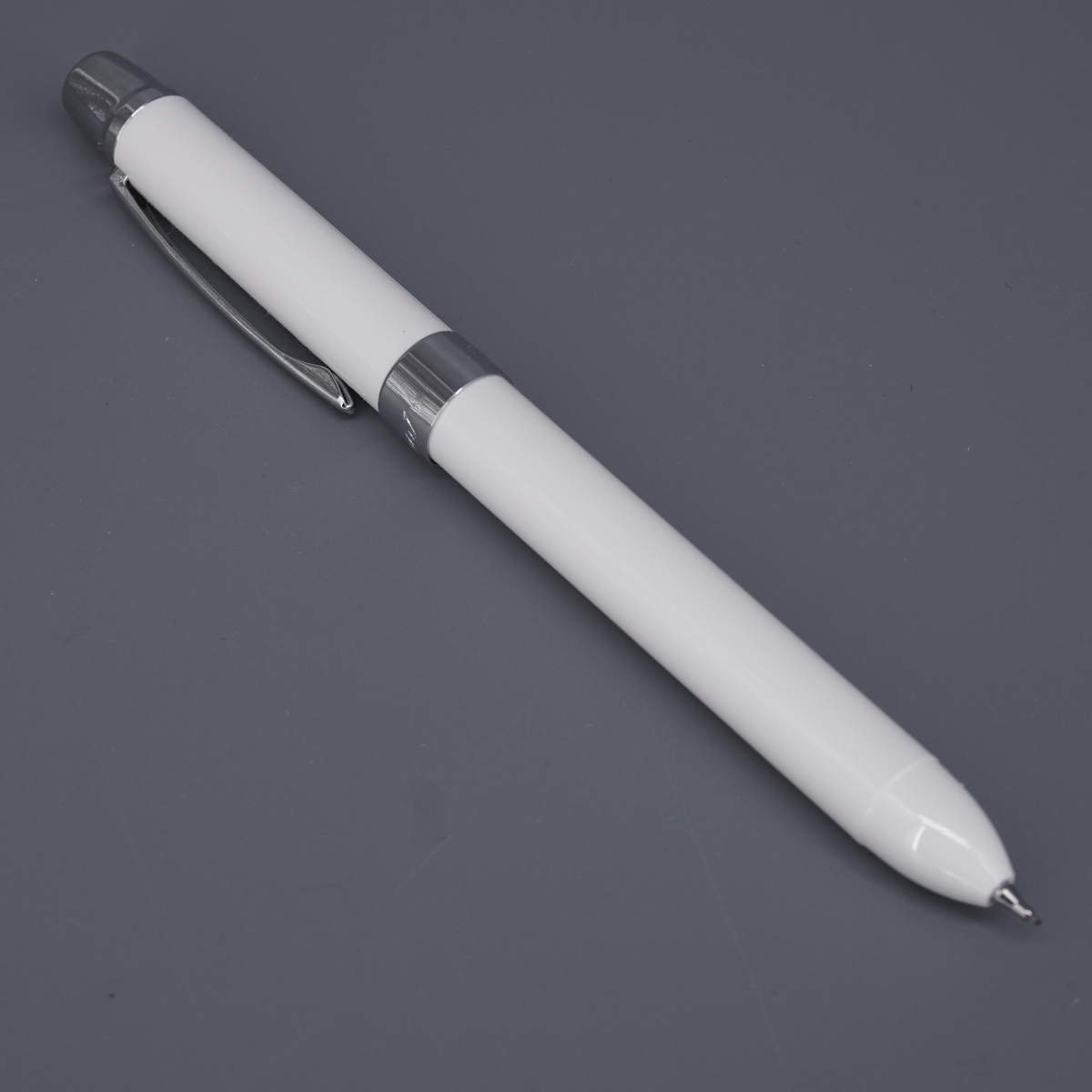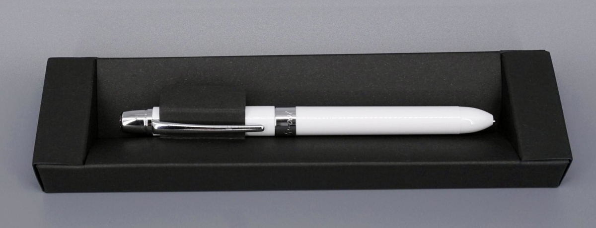 Дизайн минималистичный. Сочетание белого глянца с серебристым смотрится выигрышно. Даже не скажешь, что внутри такого корпуса прячется сразу несколько стержней, да ещё и грифель: никаких прозрачных элементов, это демонстрирующих, или же отдельных кнопок для каждого (стержня/грифеля) у ручки-карандаша нет.