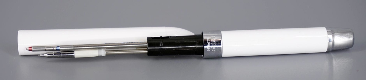 Тоже японец. Внутри корпуса два шариковых стержня (синий + красный) и карандашный грифель. Приемлемая стоимость.