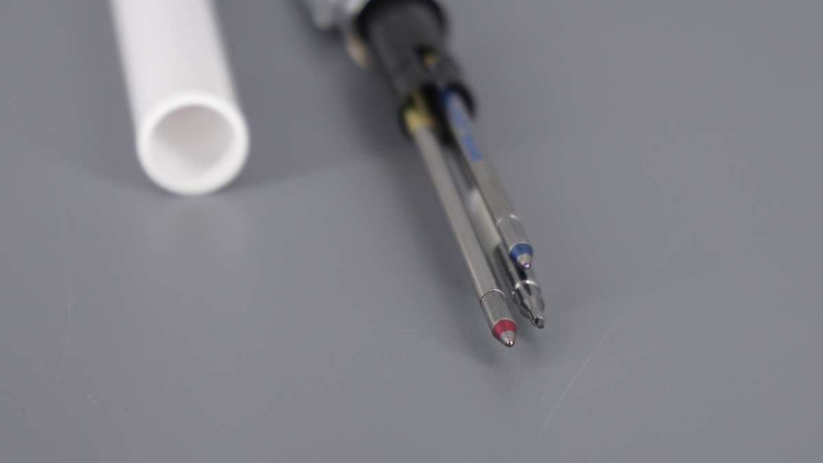 Для загрузки грифелей нужно снять карандашный механизм с трубки-шахты. Её внутренний диаметр около 1,8 мм, и туда спокойно помещаются три штуки. Новый грифель выдвигается после окончания предыдущего.