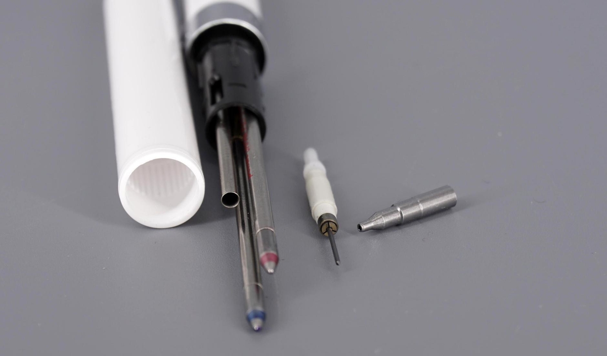 Переключение «режимов» (синий стержень — красный стержень — карандашный грифель) происходит путём поворота нижней части корпуса относительно металлического кольца.