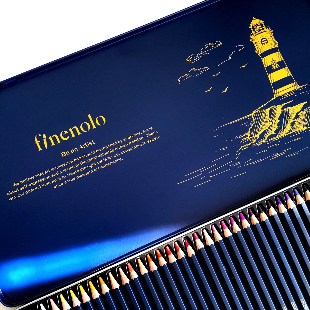 Теперь заглянем внутрь. На крышке красуется иллюстрация с маяком, есть название бренда и вдохновляющий текст о том, что искусство должно быть доступно каждому.