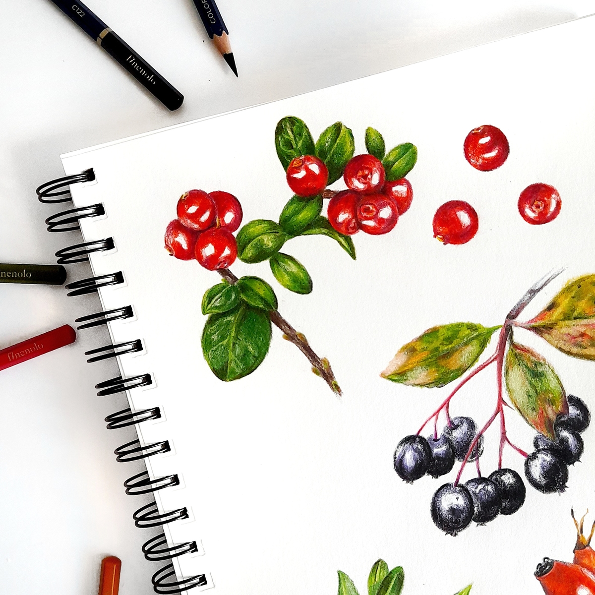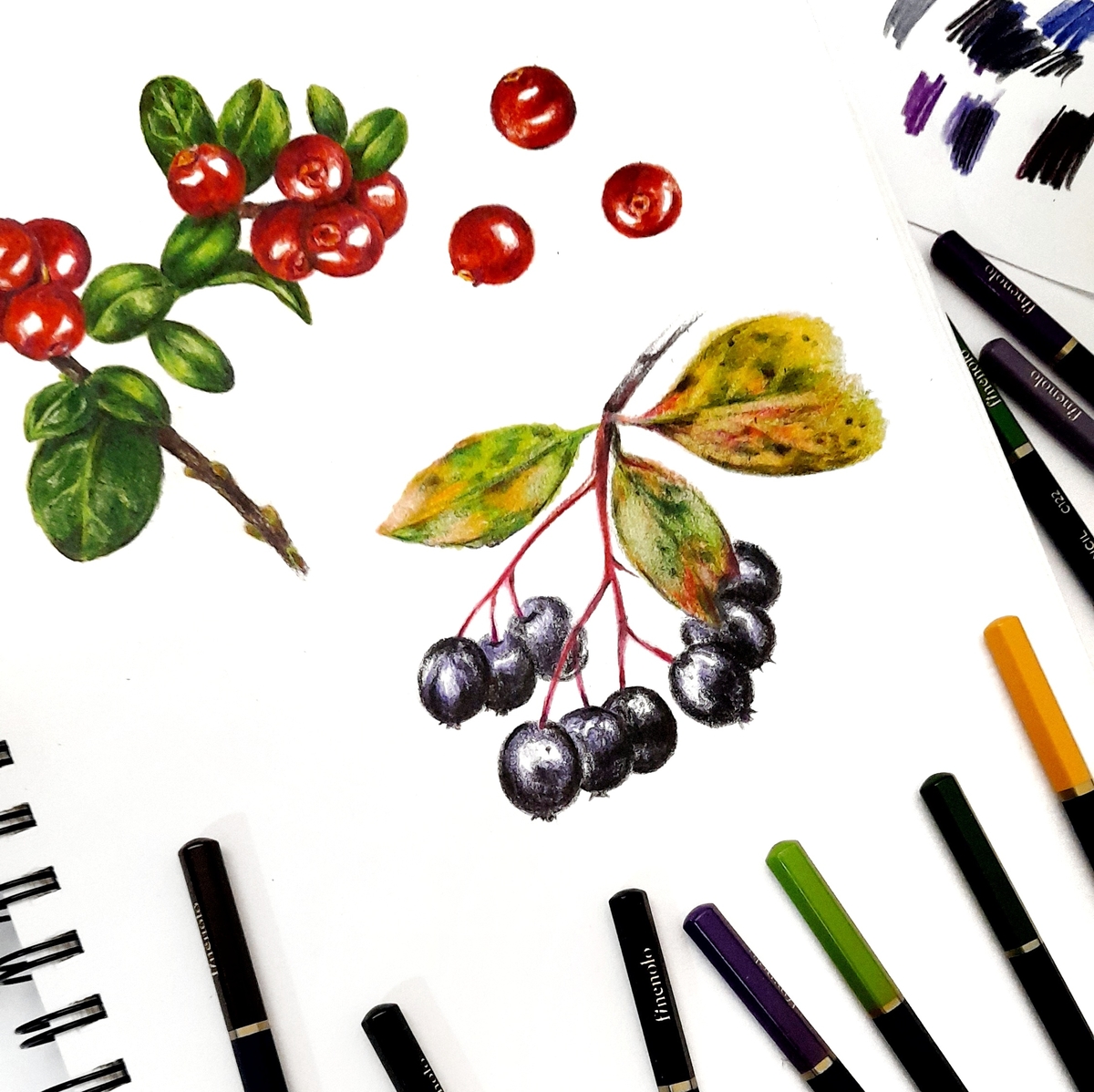 Я решила проверить смешиваемость оттенков и то, сколько слоёв удастся нанести. Для брусники использовала красные и коричневые, наслаивала их постепенно, не слишком давя на грифель.