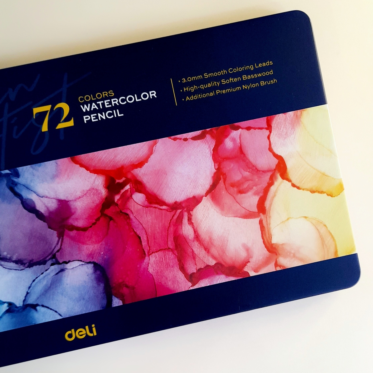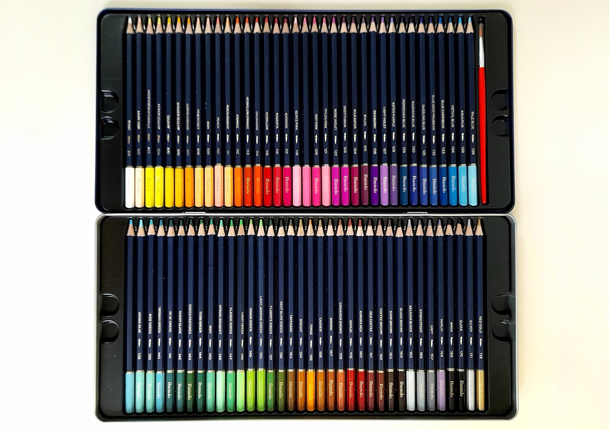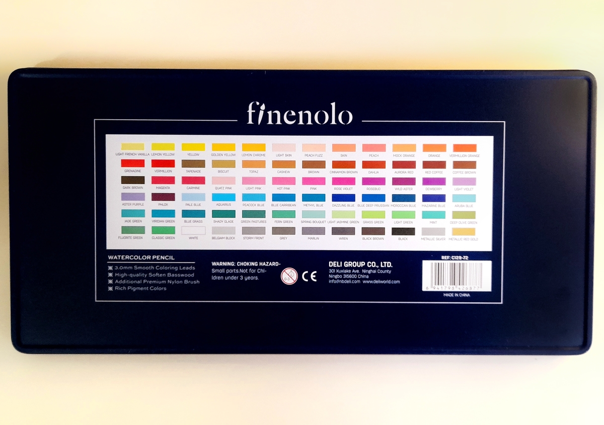 Этот набор вновь включает 72 карандаша/оттенка, и все они вновь хранятся в похожем металлическом пенале. Разве что дизайн его несколько отличается: иллюстрация на крышке уже другая — абстрактная, надпись Watercolor pencil оповещает о том, что это акварельные карандаши.