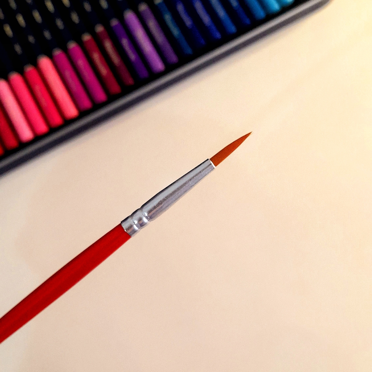 Карандаши привычно расположены на пластиковых подложках в два яруса, но к ним добавлен ещё один новый инструмент — кисть.