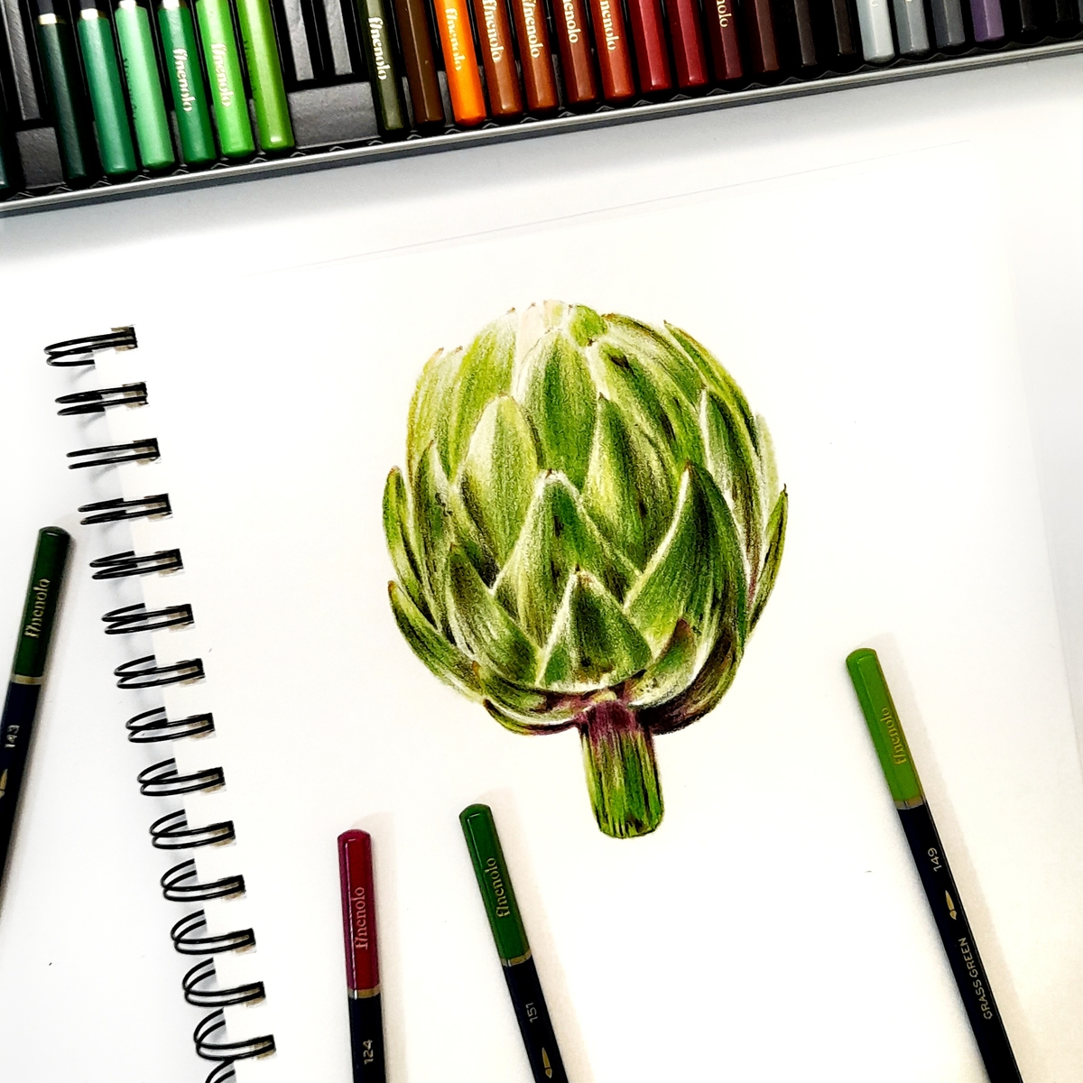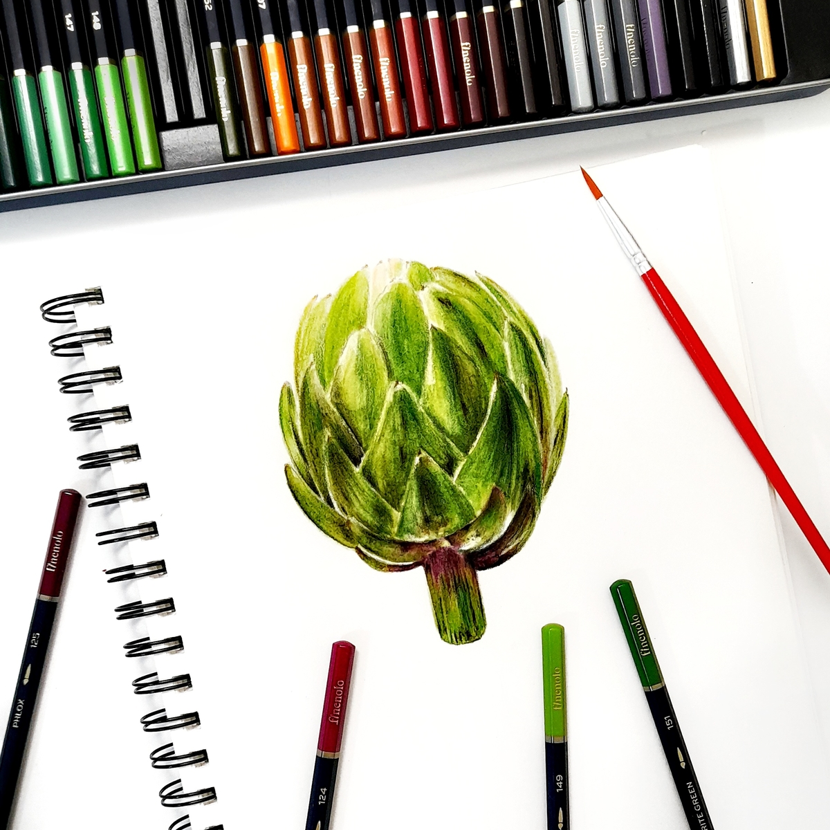Этими карандашами можно работать и без использования кисти с водой: они такие же мягкие, укрывистые и яркие, как обычные цветные. Посудите сами, артишок я нарисовала всё в том же скетчбуке Finenolo и пока ничего не размывала: