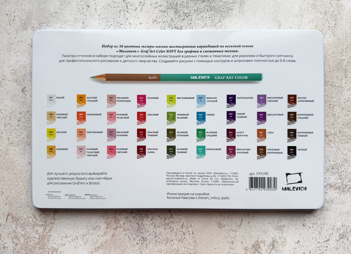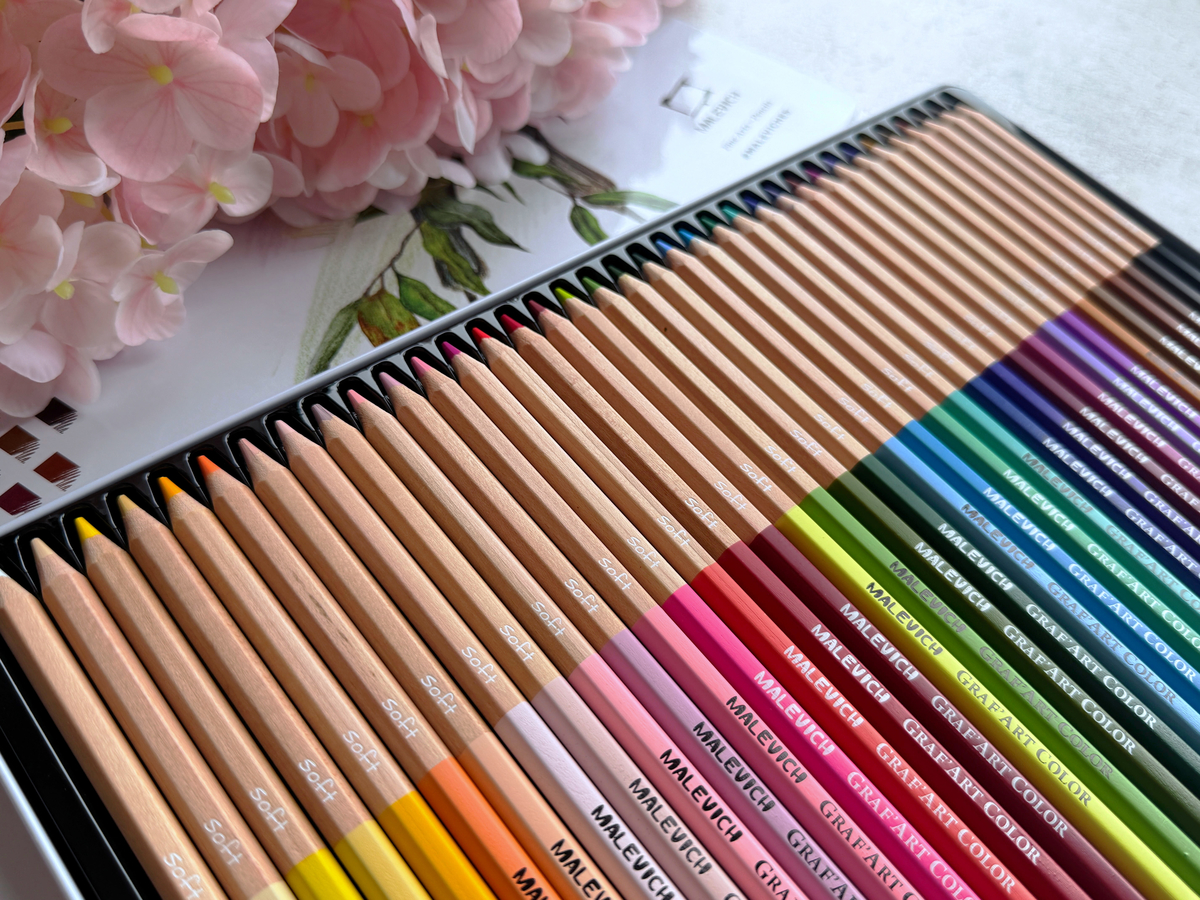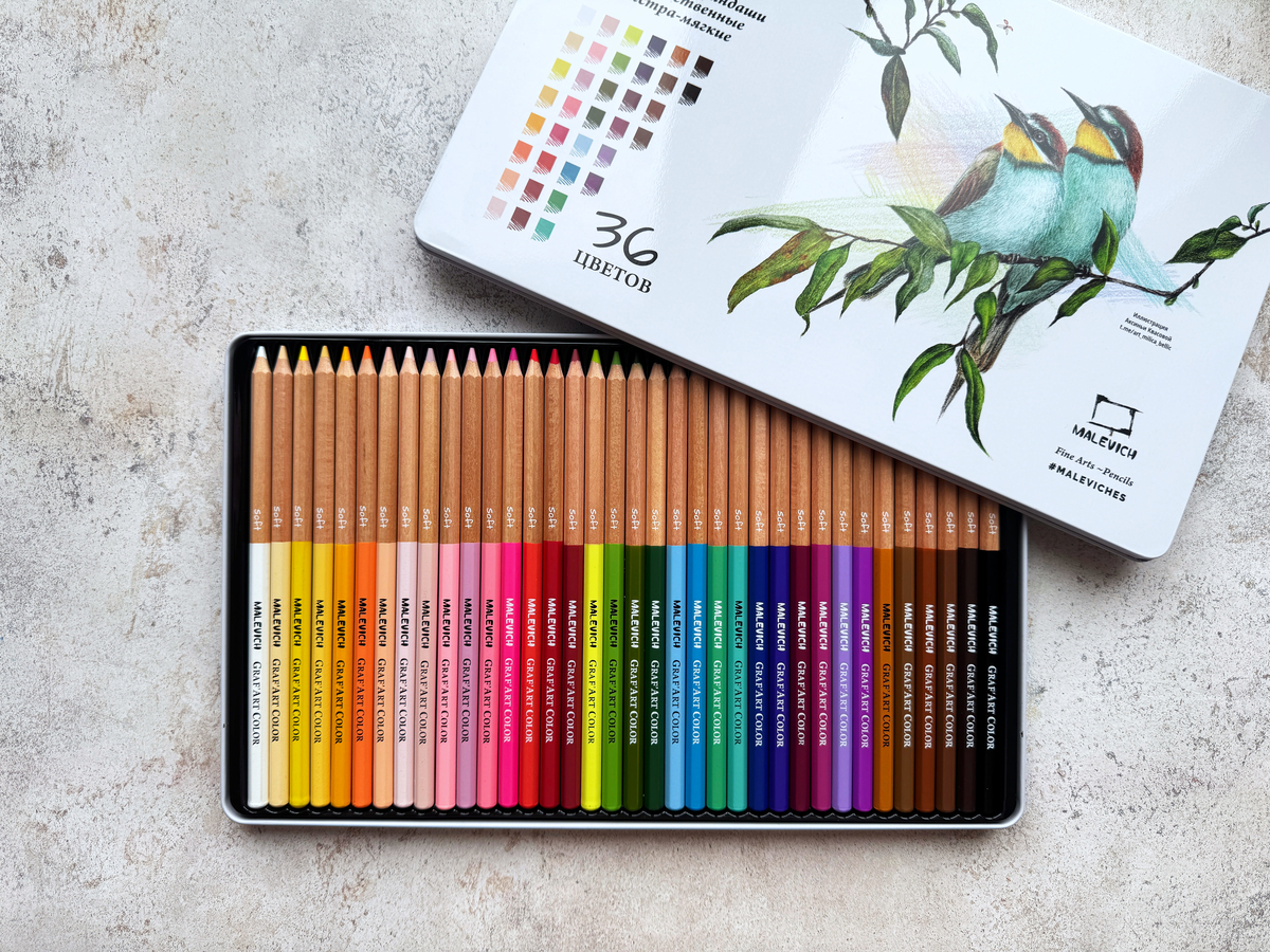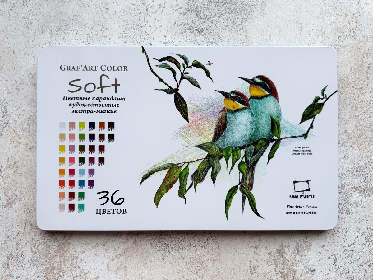 Не так давно отечественный бренд «Малевичъ» выпустил линейку цветных карандашей Graf'Art Soft. Уже имея положительный опыт использования их Graf’Art Color Pro (рассказывала здесь) и надеясь на схожие впечатления, решила познакомиться с ними. Так набор из 36 цветов оказался у меня.