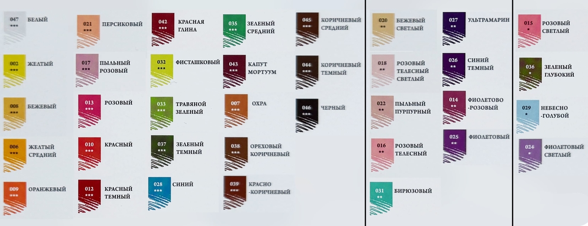 Что касается светостойкости, то лишь 11 % оттенков имеют отметку о низкой её степени (*), 25 % — о средней (**). В основном это пастельные, и многие из них я бы стала использовать для портретов: телесные, бежевые, розовые; сюда же попали почти все синие и фиолетовые. У остальных светостойкость высокая (***).