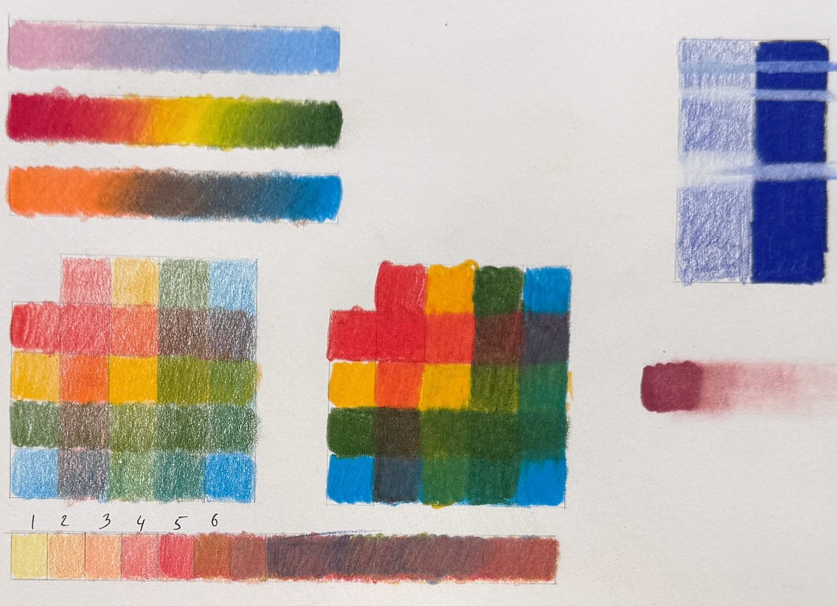 Основа грифеля этих карандашей — воск, поэтому они очень мягкие, по ощущениям пигмент наносится как масляная пастель, ближайшая аналогия — небезызвестные Prismacolor. Конечно, от оттенка к оттенку мягкость может отличаться, но это обычное дело: к примеру, ультрамарин (027) несколько твёрже остальных. При использовании немного пылят, особенно если сильно давить.