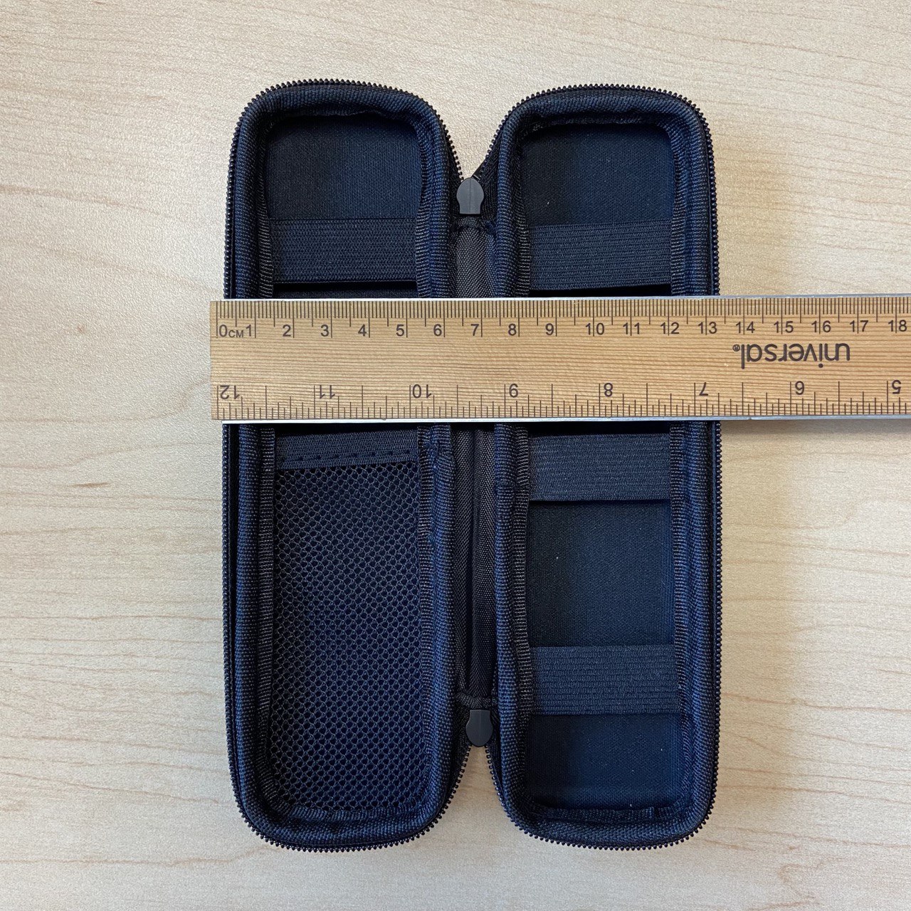 Если же говорить о внешних, когда пенал застёгнут, то длина — 20 см, ширина — около 6 см, толщина — 3,5 см.