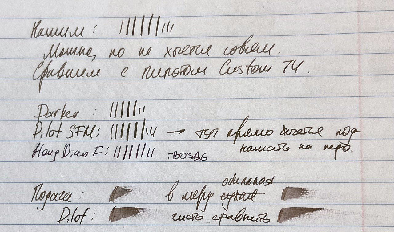 В меру обильная подача. Гладкое скольжение с едва ощутимым фидбеком. При этом перо не назвать бесшумным: шуршание по бумаге прекрасно слышно.