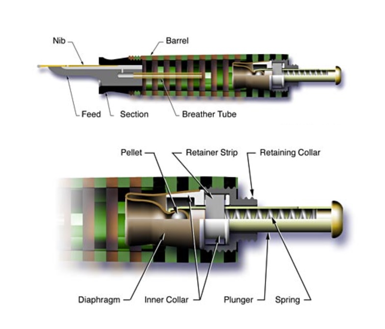У них не было пипетки, заправка производилась напрямую в корпус с использованием своеобразной диафрагмы. То есть нужно было открутить blind cap, нажать на кнопку, только та теперь давила не на пластину, а на диафрагму, сжатие которой приводило к засасыванию чернил внутрь.