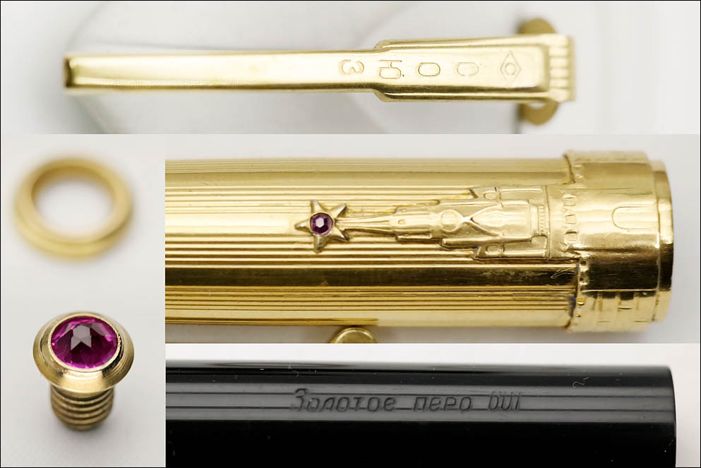 Самая главная и выразительная часть ручки — колпачок, декорированный специальной накладкой в виде рельефа Кремля, звезду которого, как и навершие колпачка, венчает искусственный рубин (корунд). Много споров и обсуждений в интернете ведется на предмет того, какие это рубины: натуральные или искусственные. И некоторые утверждают, что натуральные (после консультаций с ювелиром), однако я склонен верить, что они искусственные. На позолоченном клипе имеется тиснение логотипа завода «Союз» («С» в ромбе) с названием завода. Логотип (ранняя версия) очень похож на эмблему футбольного клуба «Спартак», только без косой черты, и, видимо, по этой причине он позже был изменён. Также на барреле, с нижней стороны относительно пера, имеется гравировка «Золотое перо 607». Поскольку набор был очень дорогой и в те времена стоил 22 руб. 50 коп (напомню о пресловутой зарплате инженера 100 руб. в месяц), я полагаю, что номер 607 является серийным номером именно этого экземпляра.