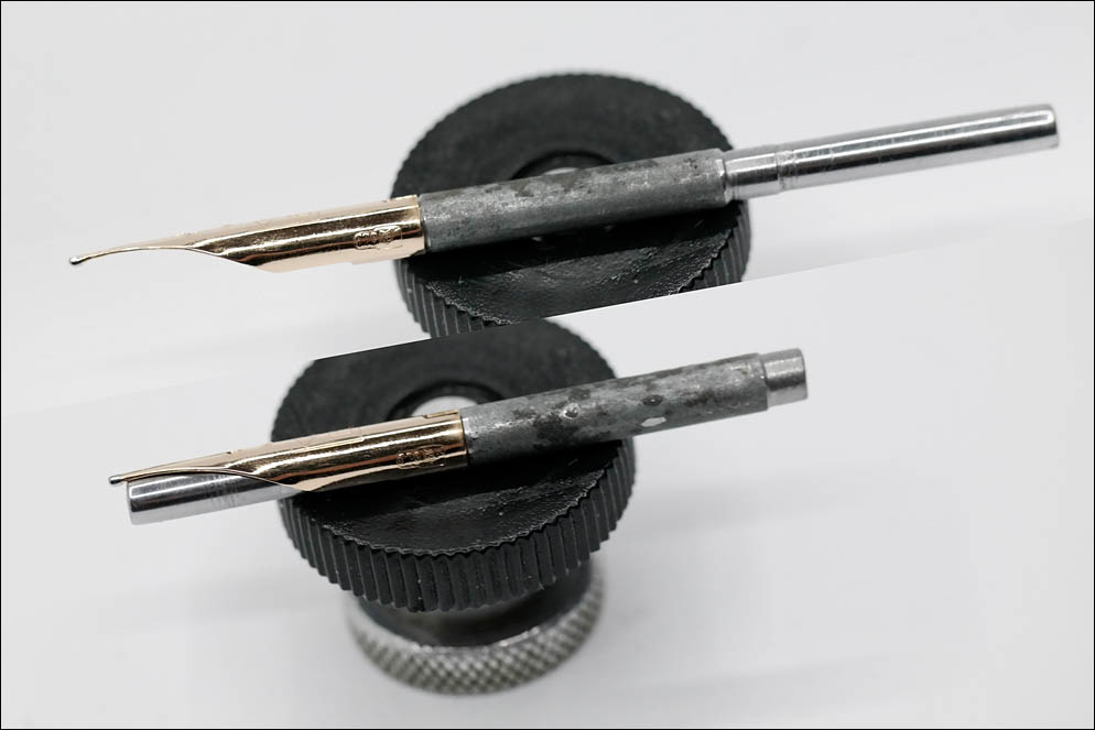 Этот инструмент попал ко мне на обслуживание, поскольку большинство инструментов советской эпохи нуждается в этом для полноценной эффективной работы. Как ни жаль почитателям советской эпохи, нестабильность качества производства очень сильно влияла на прямые функции инструментов. А если учесть ещё и лихие 90-е и вандалов, выдергивавших золотосодержащие перья из авторучек, то можно представить, что ручкам того времени пришлось нелегко. Эту ручку, по-видимому, не миновала чаша сия, ибо перо было соответствующе заломано у кончика, но то ли его не смогли достать, то ли передумали, поэтому оно осталось на месте, но немного поврежденным. Внутри ручки так же остались высохшие чернила, возможно, из того времени, которые препятствовали нормальному функционированию.