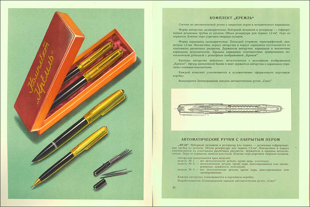 Такой набор пришел на смену комплекту «Кремль», выпускавшемуся до 1960 года. Согласно каталогу ГУМа 1956 года, этот набор имел стальное перо из пермалоя и украшался разными самоцветами. В основе модели лежала чернильная авторучка с закрытым пером модели АР-24 и механический карандаш модели АК-24 поворотного действия. Каждый комплект упаковывался в художественно-оформленную картонную коробку красного цвета. Комплект «Москва», пришедший на смену в 1960 году, уже комплектовался золотым пером, но упаковывался в аналогичную коробку. А в 1965 году картонная коробка была заменена на пластиковую.