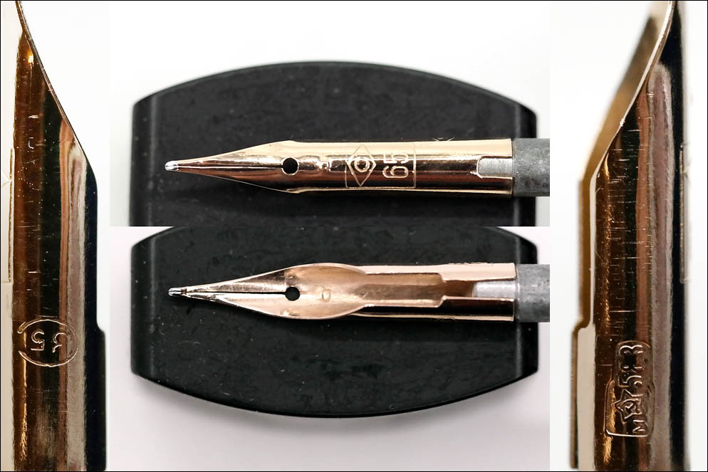 Перо: золотое, трубчатое, 583 пробы (аналог 14К золота), очень мягкое и флексовое. Перо устанавливается на тонкий эбонитовый фидер, затем вставляется в пластиковый прозрачный коллектор, который устанавливается в пластиковую втулку, переходящую в гофрированную трубку. На перо по центру нанесён логотип завода «Союз» и число 65 — год производства. С правой стороны имеется клеймо 35 в овале. Я не знаю достоверно, что оно означает, но предполагаю, что это тип пера (трубчатое). С левой стороны имеется стандартное клеймо золотосодержащего изделия СССР того времени в виде «лопаточки», где указана буква М (маркер центральной инспекции пробирного надзора, Москва), «звезда с серпом и молотом» (пробирное клеймо используемое в 1958—1993 гг.) , 583 — проба золота, соответствующая 14 каратам.