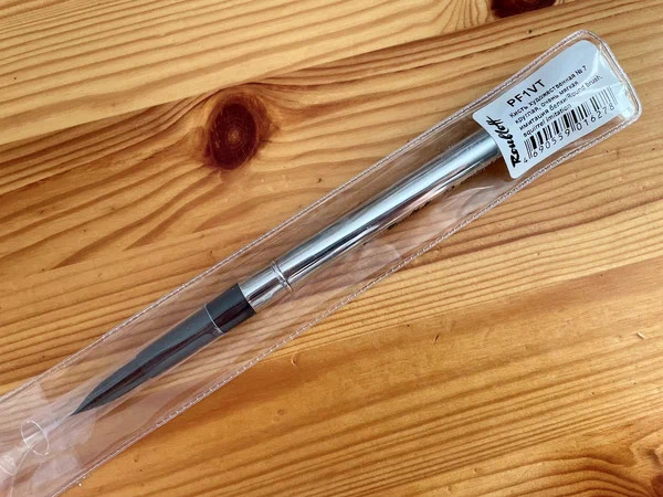 Выбирала кисть недолго. В основном искала среди известных мне брендов и за среднюю стоимость («Альбатрос», «Малевичъ», Roubloff). «Малевичъ» отпугнул противоречивыми отзывами и высокой ценой. «Альбатрос» тоже не вызвал доверия, хотя по цене оказался близким к Roubloff. В итоге заказала кисть того бренда, в котором не сомневалась (Roubloff) и цена была приемлемая (518 р. + доставка). Сам ворс у неё синтетика, имитация белки.