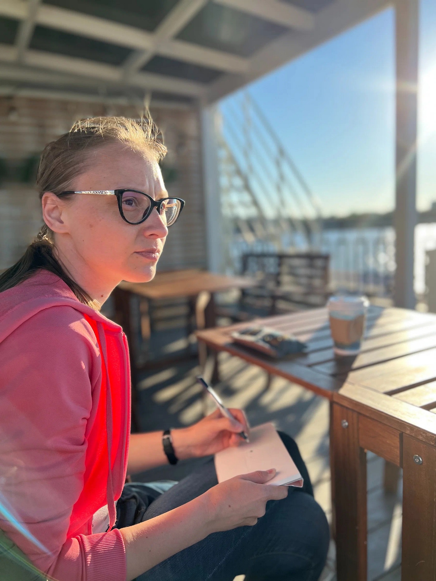 Понятное дело, рисовала я в разных условиях. Можно устроиться на краешке бордюра прямо на асфальте, можно найти лавочку в тенёчке или же взять чай и устроиться за столиком на веранде кофейни.