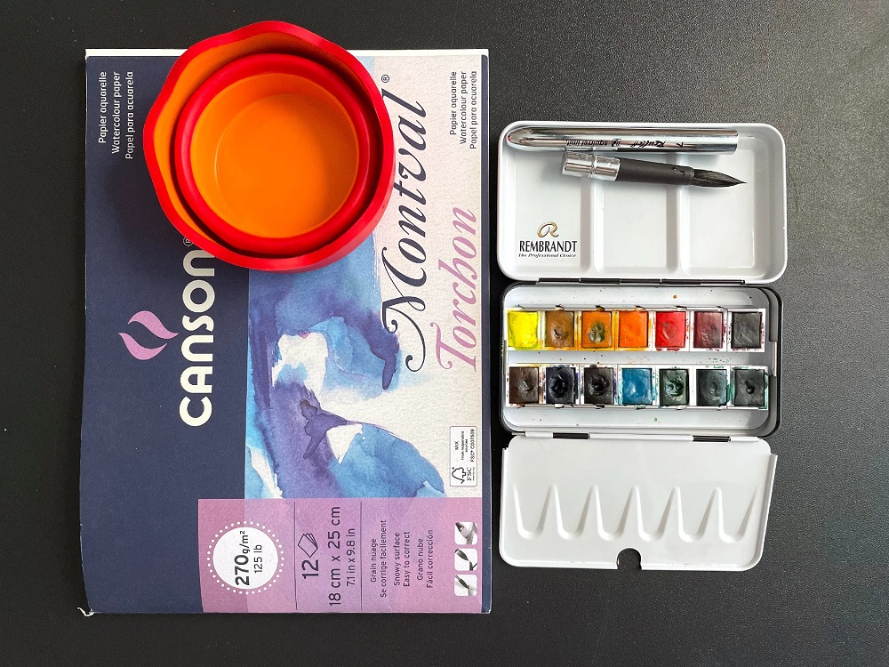 С собой я взяла минимальный походный набор: складная кисть, небольшой набор акварели Rembrandt, складной силиконовый стаканчик, несколько вариантов бумаги небольшого формата, карандаш, ластик и линер. Самое главное не забыть налить небольшую бутылочку воды. Не везде можно найти воду непосредственно на месте работы.