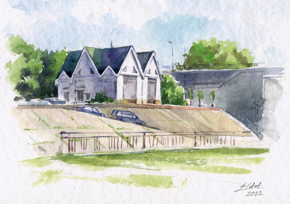 Второй сюжет появился на развороте хлопкового скетчбука от «Малевичъ». Правда, я немного слукавила и убрала с переднего плана большой навес с качелями и деревья, поэтому в работе ощущение широкого пространства перед трамваем.