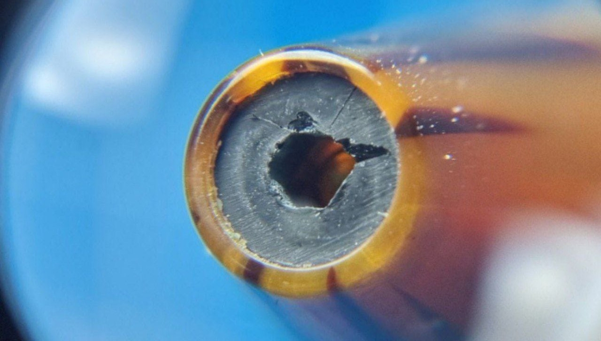 Первым делом ручку нужно отмыть и попытаться установить точное место протечки. Сделать первое в полной мере не удалось, так как чернила буквально въелись в целлулоид. Поэтому решено было корпус сразу отшлифовать и отполировать (шагрень-то всяко пришлось бы убирать и восстанавливать «косметику»).