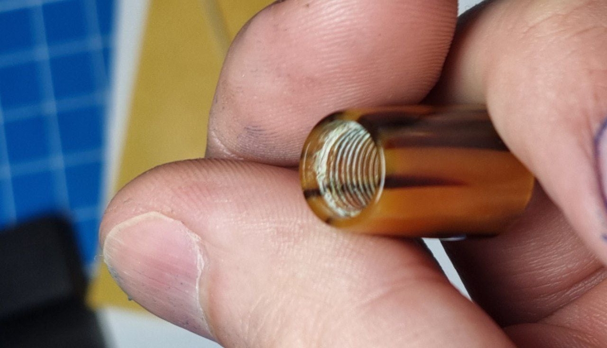 Несмотря на то, что целлулоид практически не прозрачен на просвет, мне удалось увидеть, что чернил между внутренней колбой и барелем нет, а значит, колба уцелела. Скорее всего, произошла разгерметизация в районе грип-секции/перьевого узла, следовательно снимать сам корпус явной нужды нет.